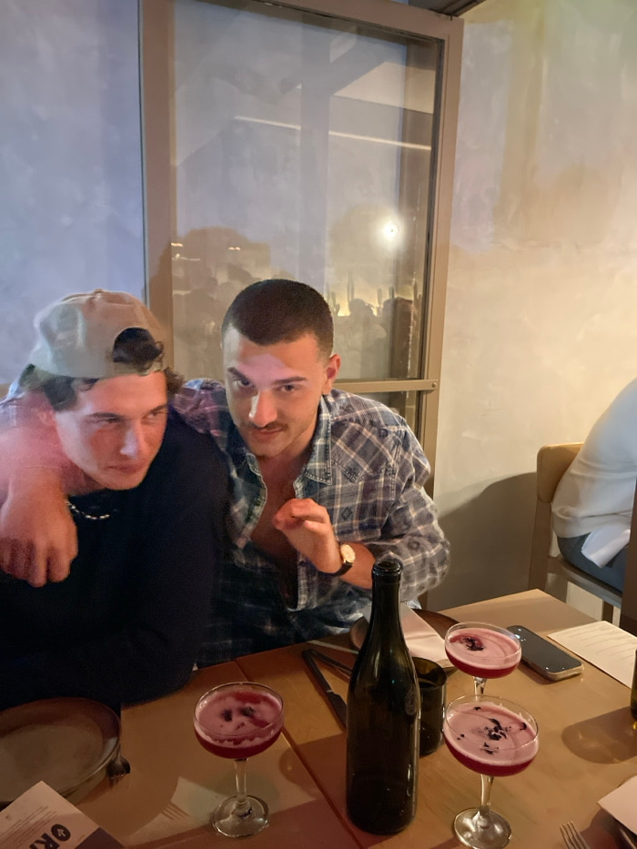 Two people are seated at a table in a restaurant. One person wears a plaid shirt, and the other person wears a dark shirt and a baseball cap. On the table, there are two cocktails, a wine bottle, a ce…read more
