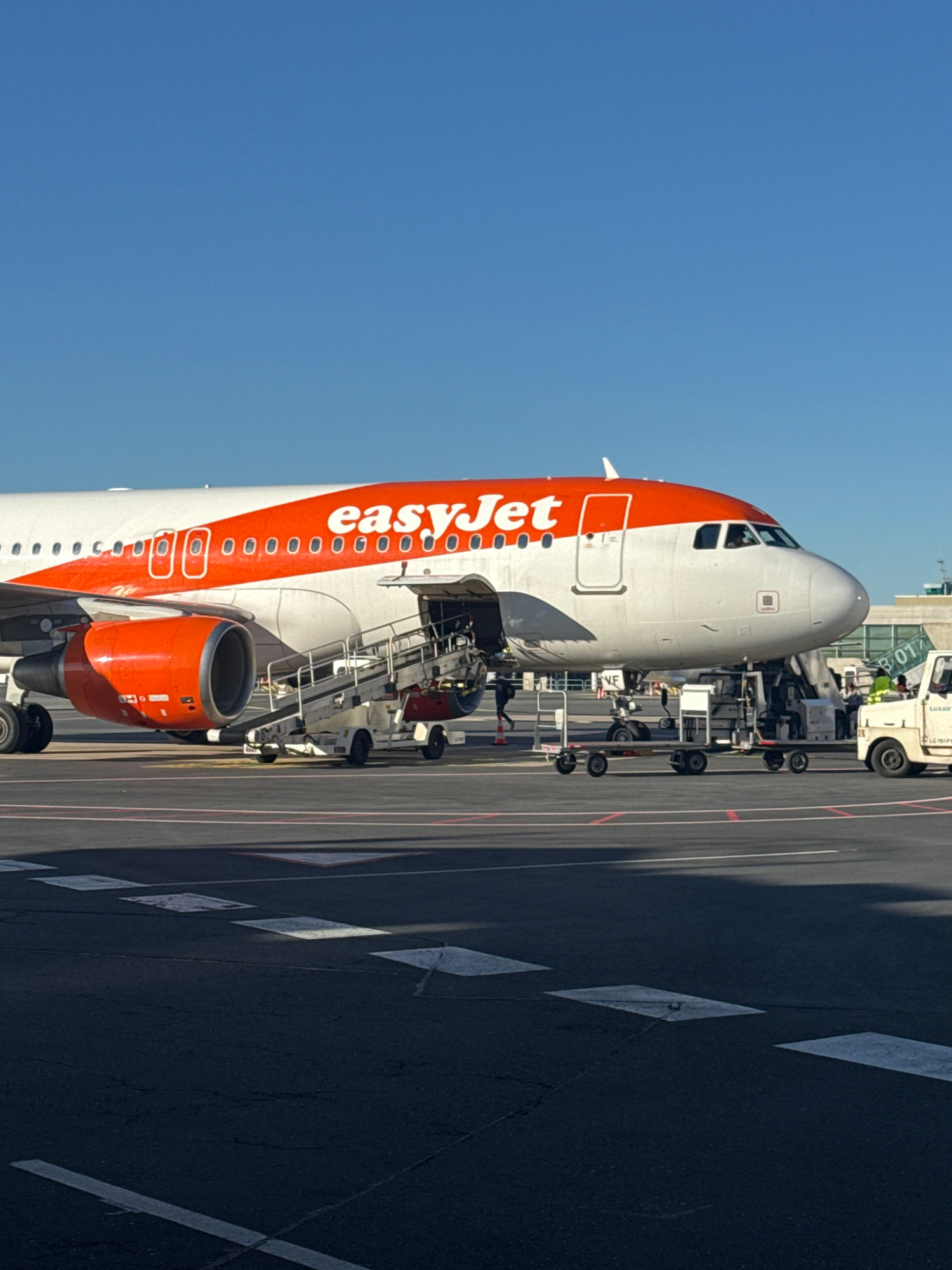 An EasyJet Airbus A320 series aircraft is parked at a gate, likely at Luxembourg Airport (LUX) which is located within Niederanven, Luxembourg. The aircraft is connected to ground service equipment vi…read more