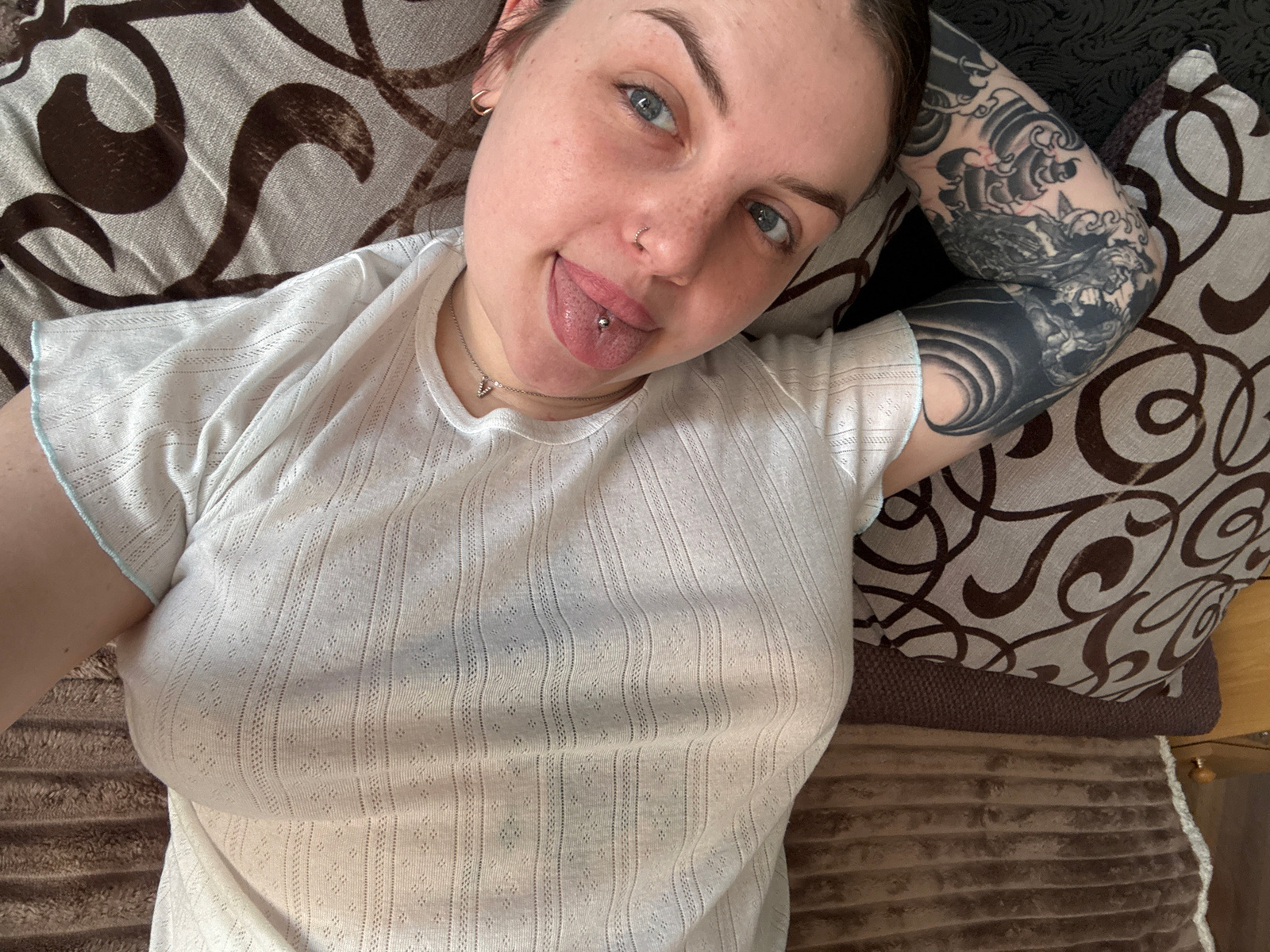 A selfie of a woman lying on a bed or couch. She is wearing a white, short-sleeved shirt with a patterned texture. She has visible tattoos on her left arm and piercings in her tongue and nose. The pil…read more