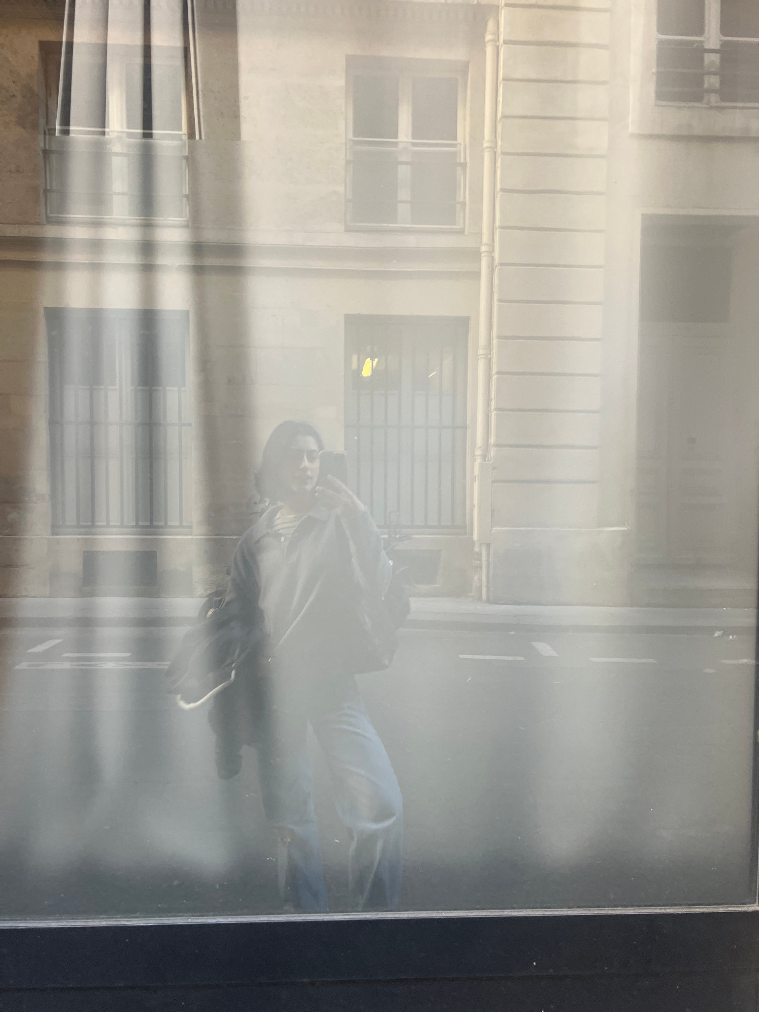 The image shows a photograph on a reflective surface, likely framed. The photo depicts a man in casual clothing standing on a street in what appears to be Paris, France. The background features a ligh…read more