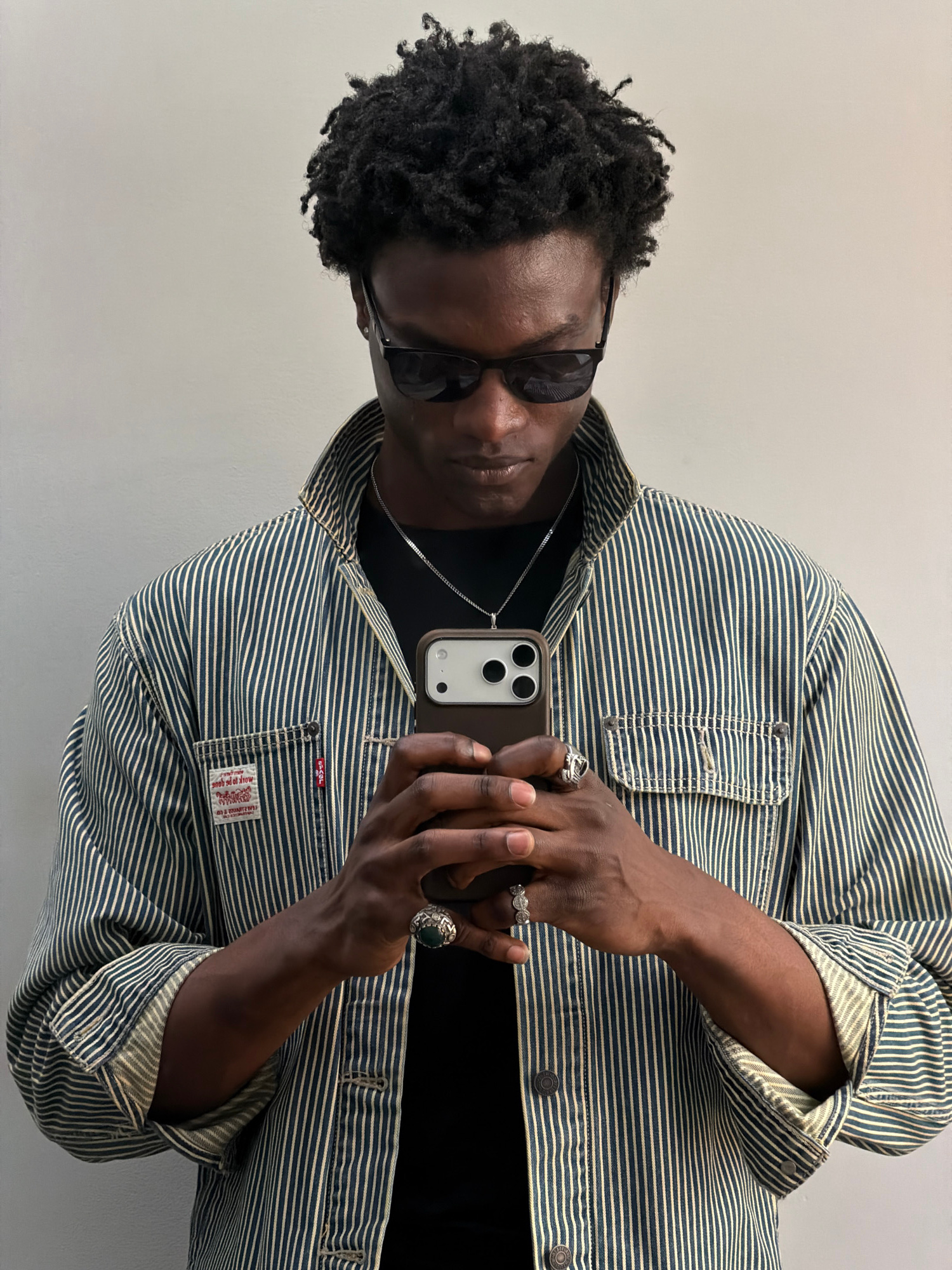 A person with dark skin and short, curly black hair is depicted in a close-up, chest-up selfie, holding a smartphone with both hands. The subject wears dark rectangular sunglasses, obscuring their eye…read more