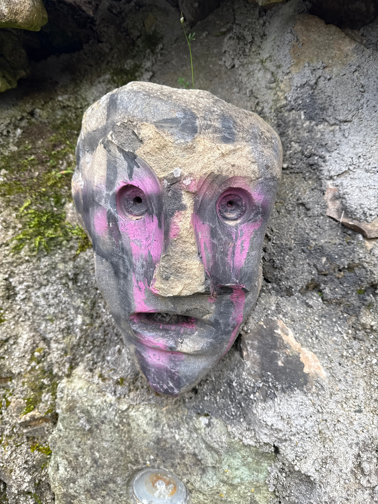 The image shows a stone sculpture, appearing to depict a stylized face, lying outdoors on a stone surface. The sculpture is composed of gray stone with pink and black painted markings that suggest fac…read more