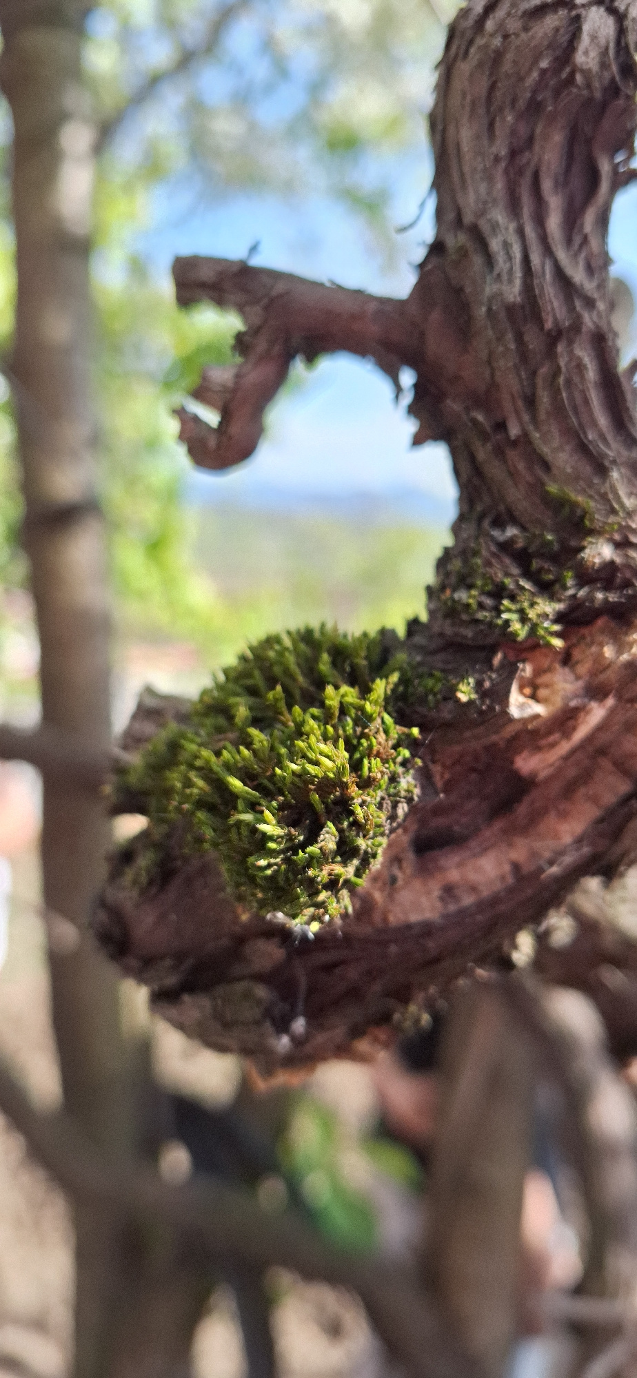 A close-up shot shows a section of tree bark covered in a dense patch of green moss. The bark is textured with deep ridges and grooves. The moss appears to be growing preferentially in a sheltered are…read more