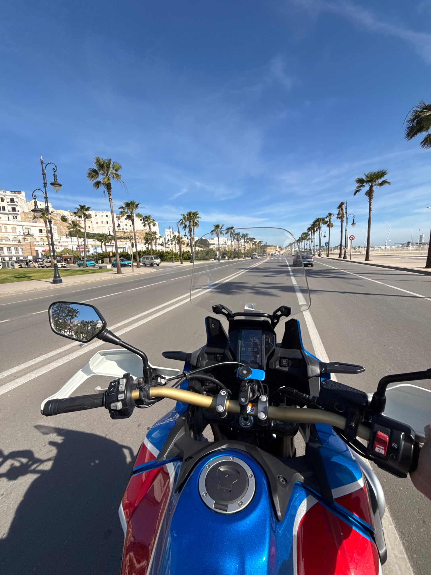 The image captures a first-person perspective from an adventure-style motorcycle, looking forward down a wide, multi-lane road in Tangier, Morocco. The motorcycle's blue, red, and white tank and fairiβ¦read more