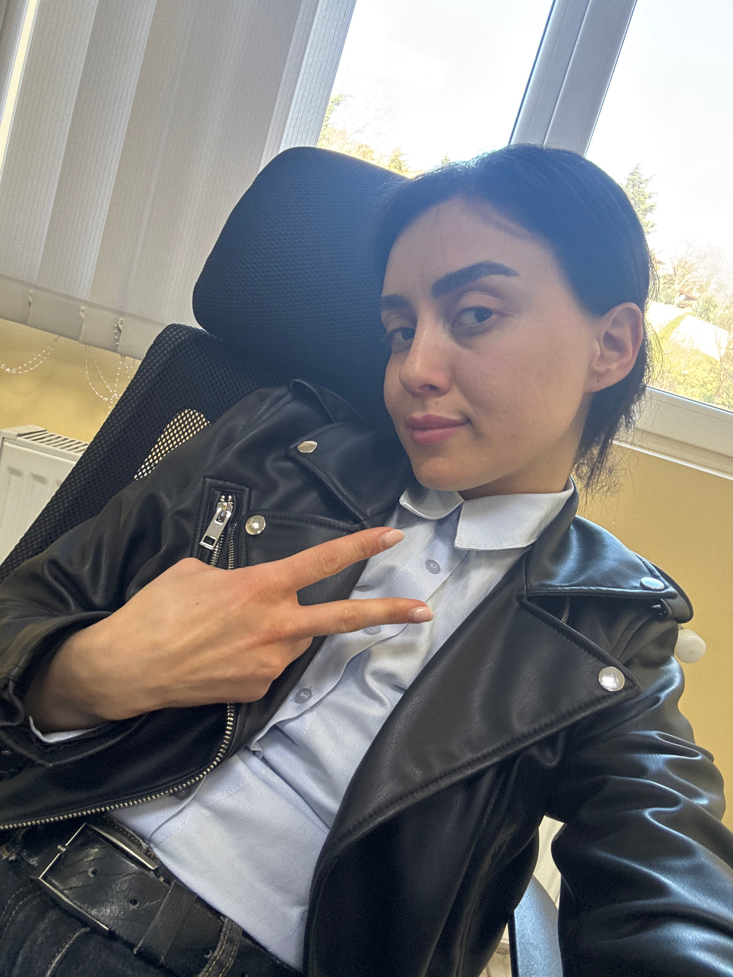 A person is seated in a black office chair, leaning their head against the headrest. They are wearing a light blue button-down shirt and a black leather jacket. The person's hand is raised, making a p…read more