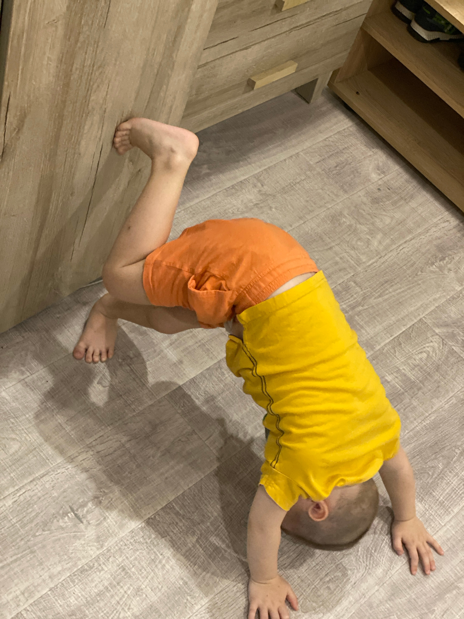 A young child is lying prone on a light-colored, wood-grain floor. The child is wearing a yellow t-shirt and orange shorts. The child's head is turned down and to the side, with the hands outstretched…read more