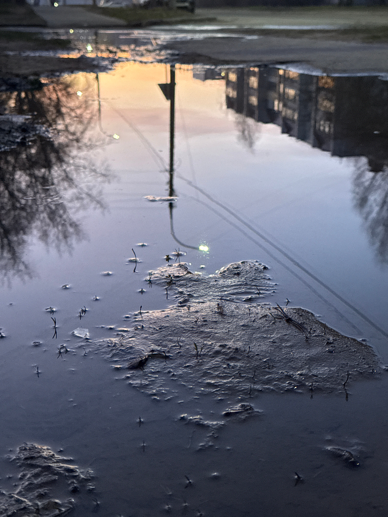 This vertical image captures a close-up view of a puddle, reflecting an urban environment. The left side of the frame is dominated by the dark, textured surface of the puddle, which appears to contain…read more