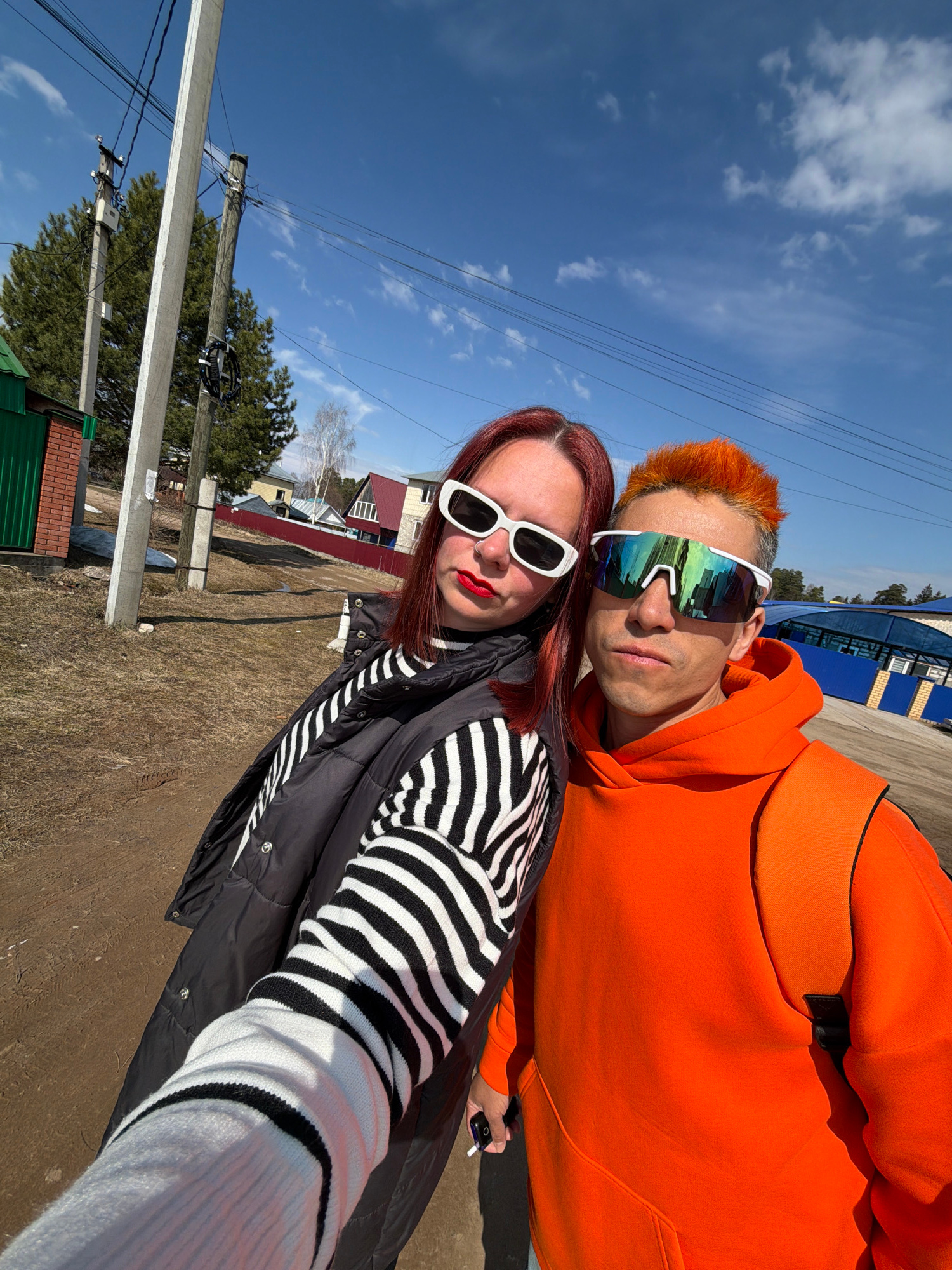 A bright, sunny selfie captures two individuals outdoors, likely in Chaikovsky, Russia. The image is taken from a slightly upward angle, showing a vast expanse of clear blue sky with sparse white clou…read more