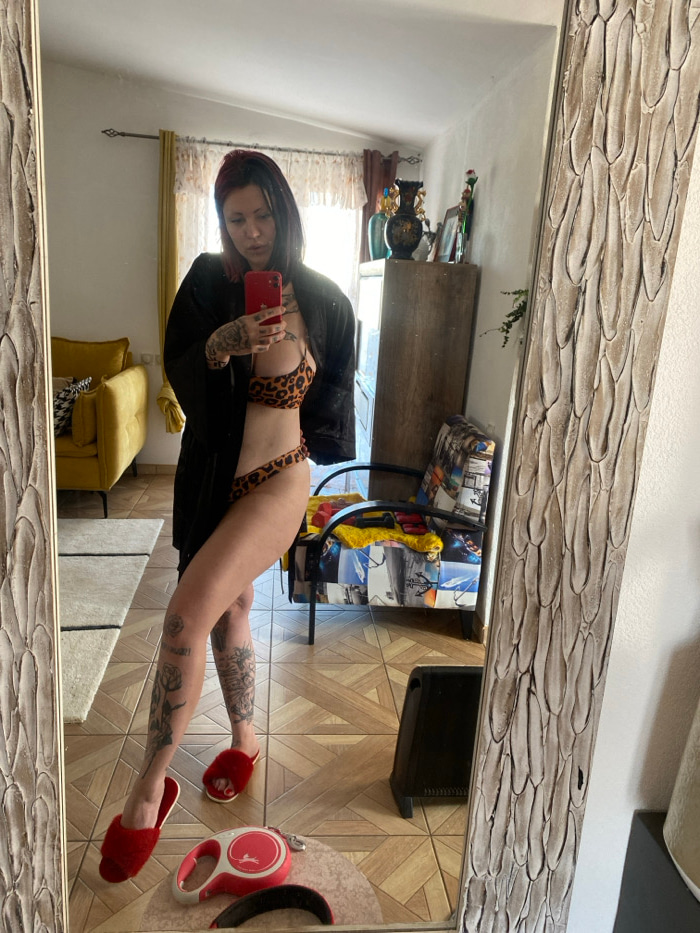 An individual with dark hair and red highlights, exhibiting multiple tattoos on both arms and legs, is depicted taking a mirror selfie in a room located in Kunje, Montenegro. She wears a black open ro…read more