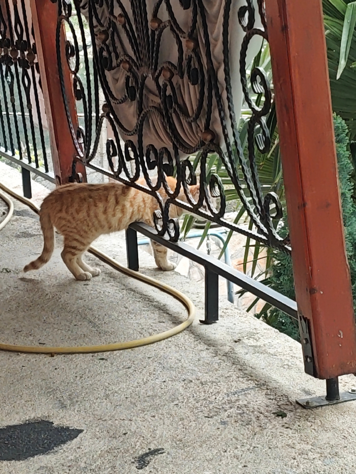 An orange tabby cat walks along a concrete surface near a wrought-iron railing, with a yellow garden hose nearby. The location appears to be an outdoor balcony or patio, with vegetation visible beyond…read more