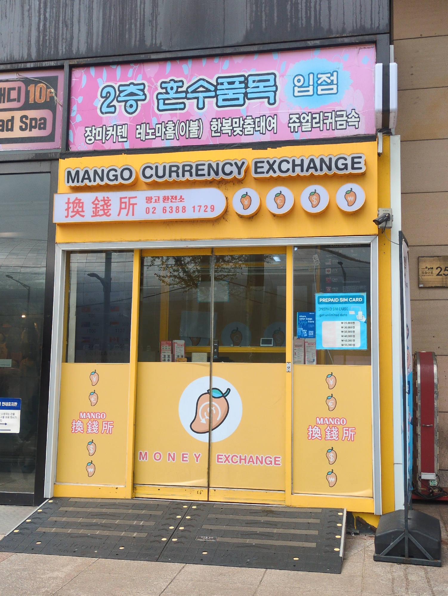 Here is a description of the image: The image shows the exterior of a small money exchange booth called "Mango Currency Exchange." The booth is yellow with images of mangoes and exchange-related symb…read more