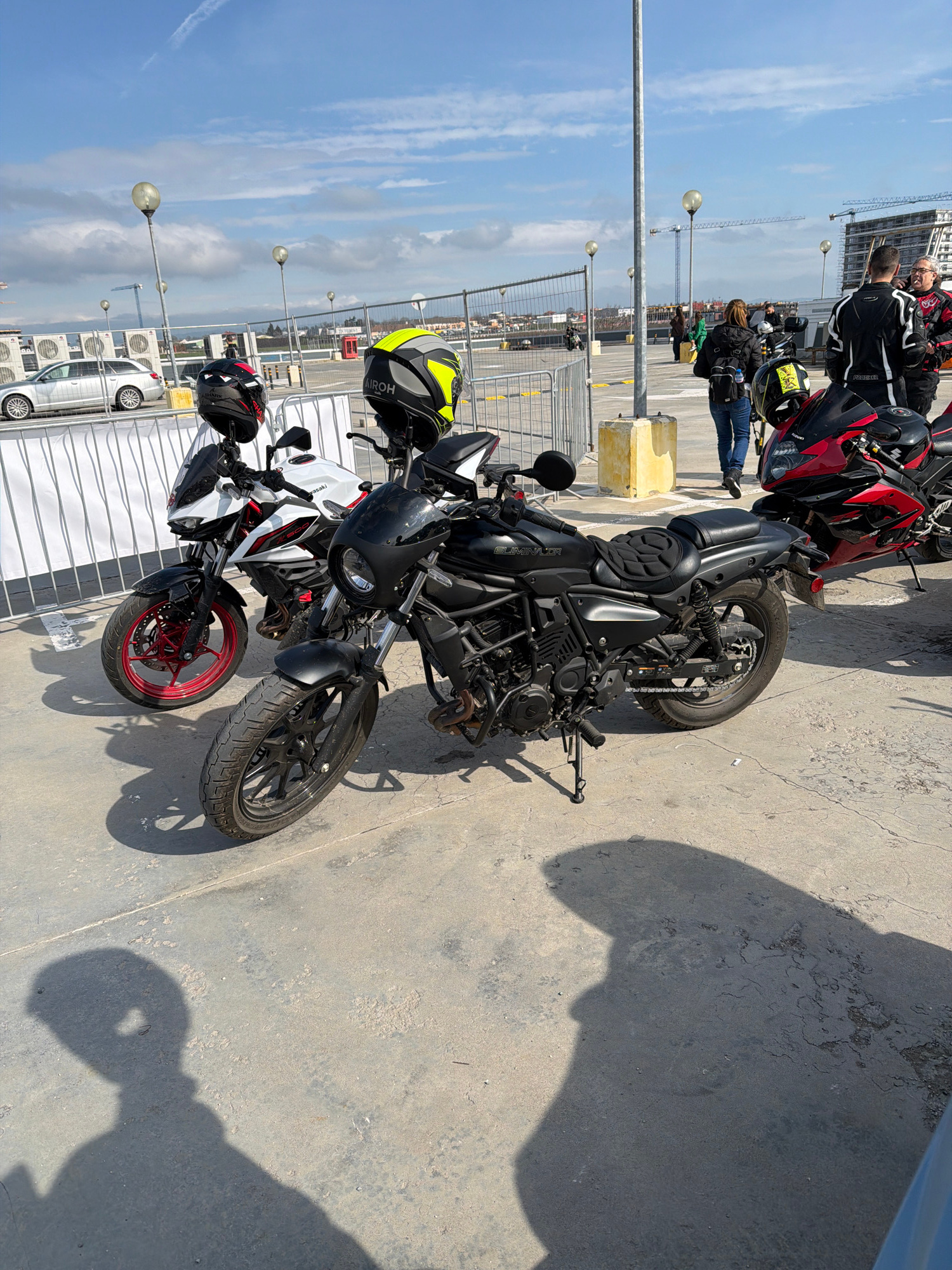 The image shows a group of motorcycles parked on a concrete surface. A white and red Kawasaki motorcycle is positioned near a metal fence, next to a black motorcycle. Helmets are placed on the motorcy…read more