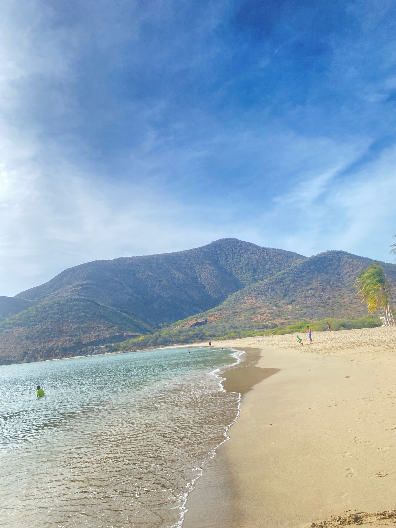 The image depicts a beach scene in Juan Griego, Venezuela. A large, green-covered mountain slopes down towards the beach. A sandy beach is visible with gentle waves breaking along the shoreline. Sever…read more