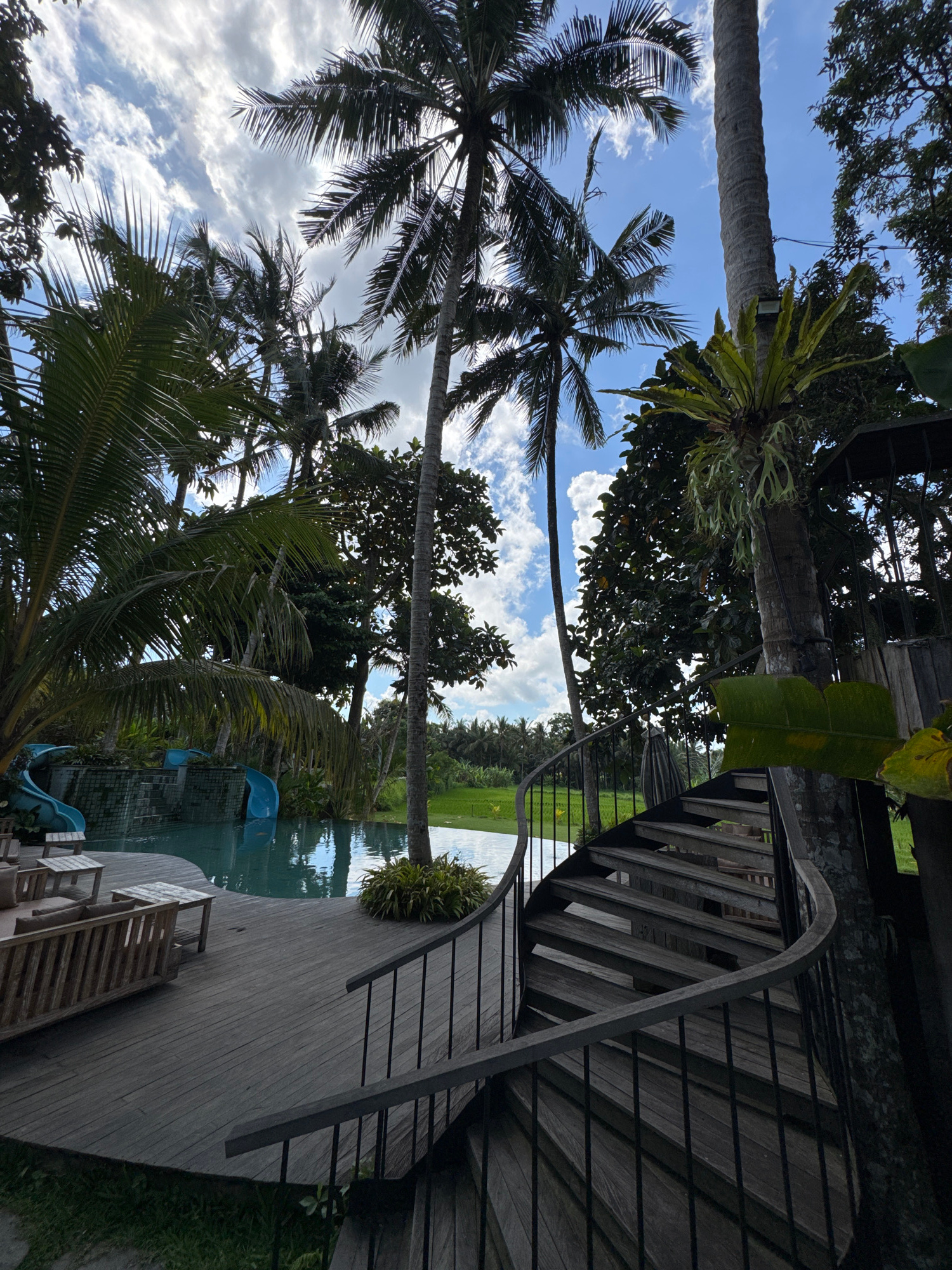 The scene is an exterior shot taken in Peliatan, Indonesia, featuring a swimming pool surrounded by tropical vegetation. Palm trees reach towards a blue sky dotted with white clouds. A wooden deck wit…read more