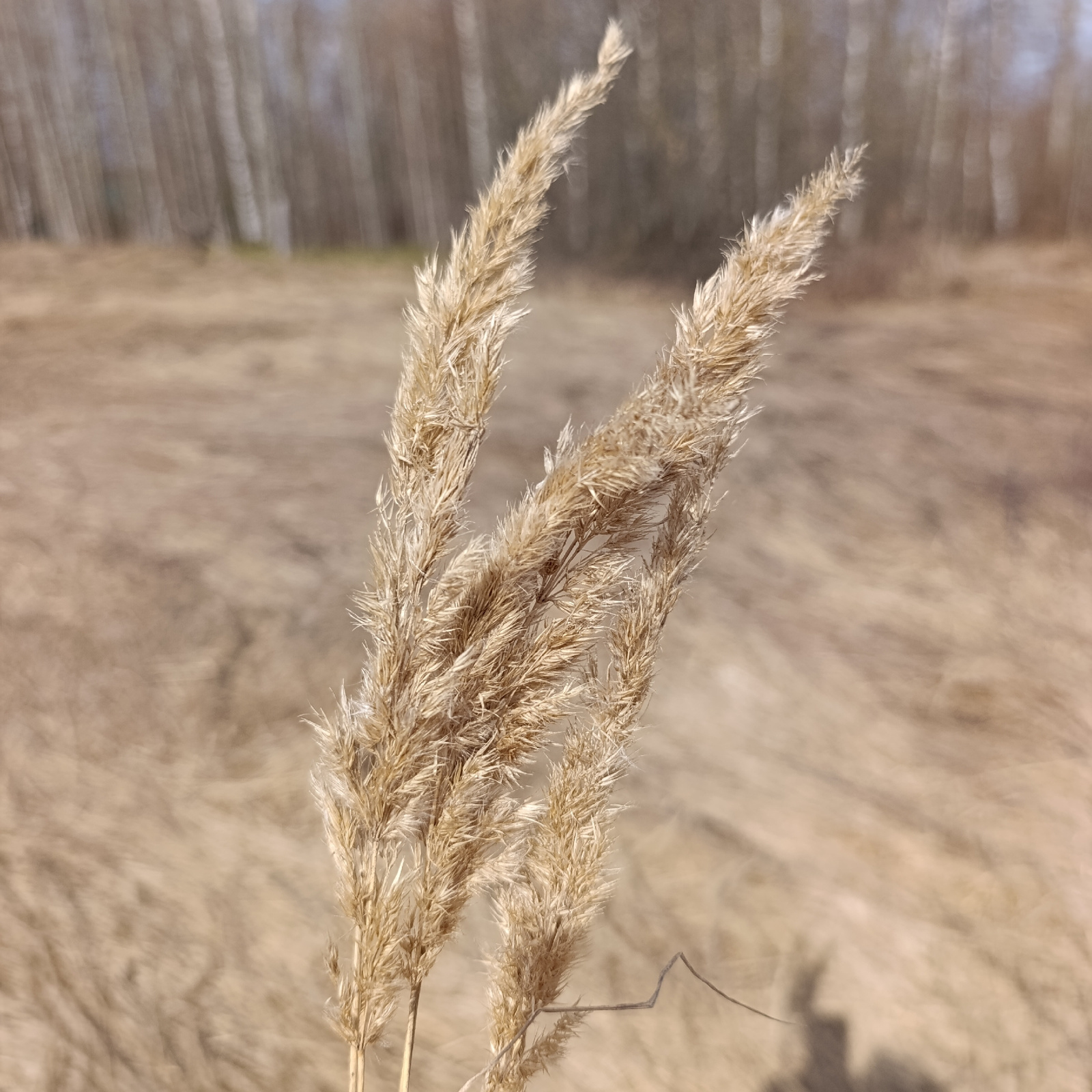 A close-up shot depicts three stalks of dry, tan-colored grass in the foreground. The background features a blurred expanse of similar dry grass and what appears to be a stand of birch trees out of foβ¦read more