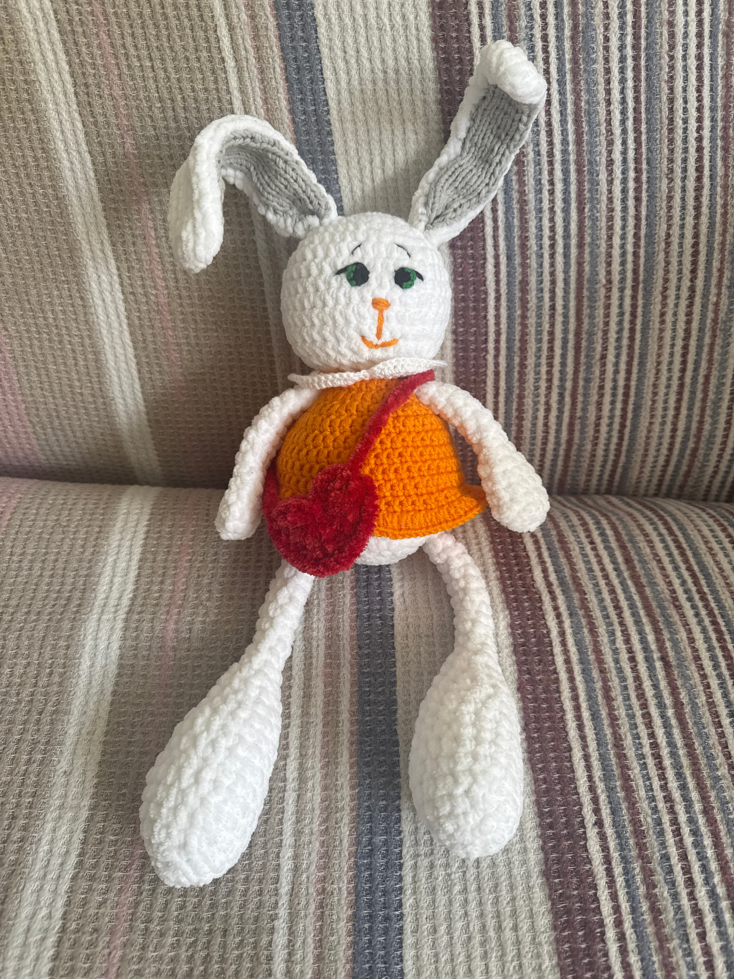 A white, crocheted bunny plush toy is depicted in a seated position on a multi-striped textile surface. The toy features large green eyes, an orange stitched nose, and a thin orange stitched smile. It…read more