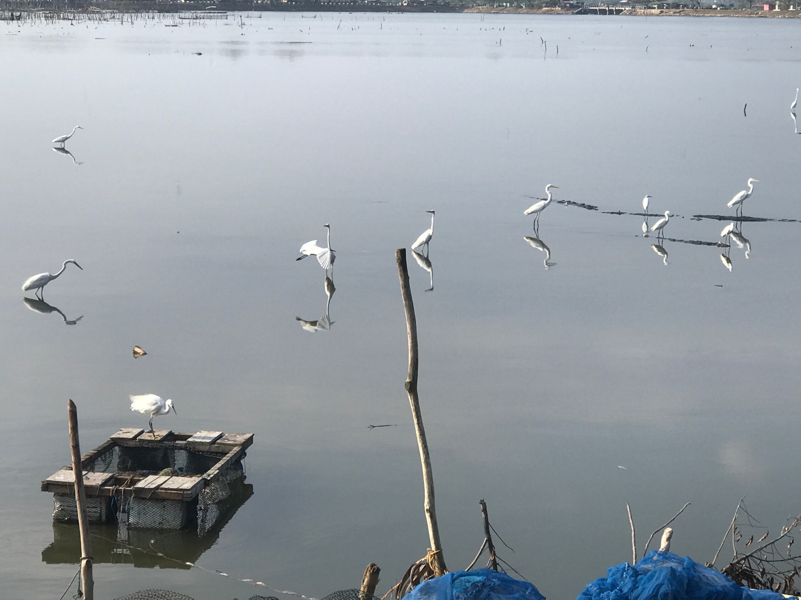 The image shows a calm, gray-toned body of water, likely a lagoon or lake, with a distant shoreline visible in the background. A wooden raft-like structure sits in the foreground, with a white bird pe…read more
