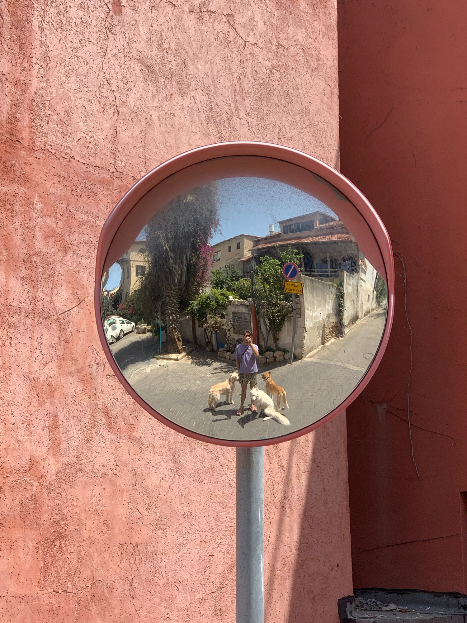 A traffic safety mirror is mounted on a pink wall and reflects a narrow street scene. A man wearing a purple shirt and shorts is walking with several dogs along the street. Buildings line the street,…read more
