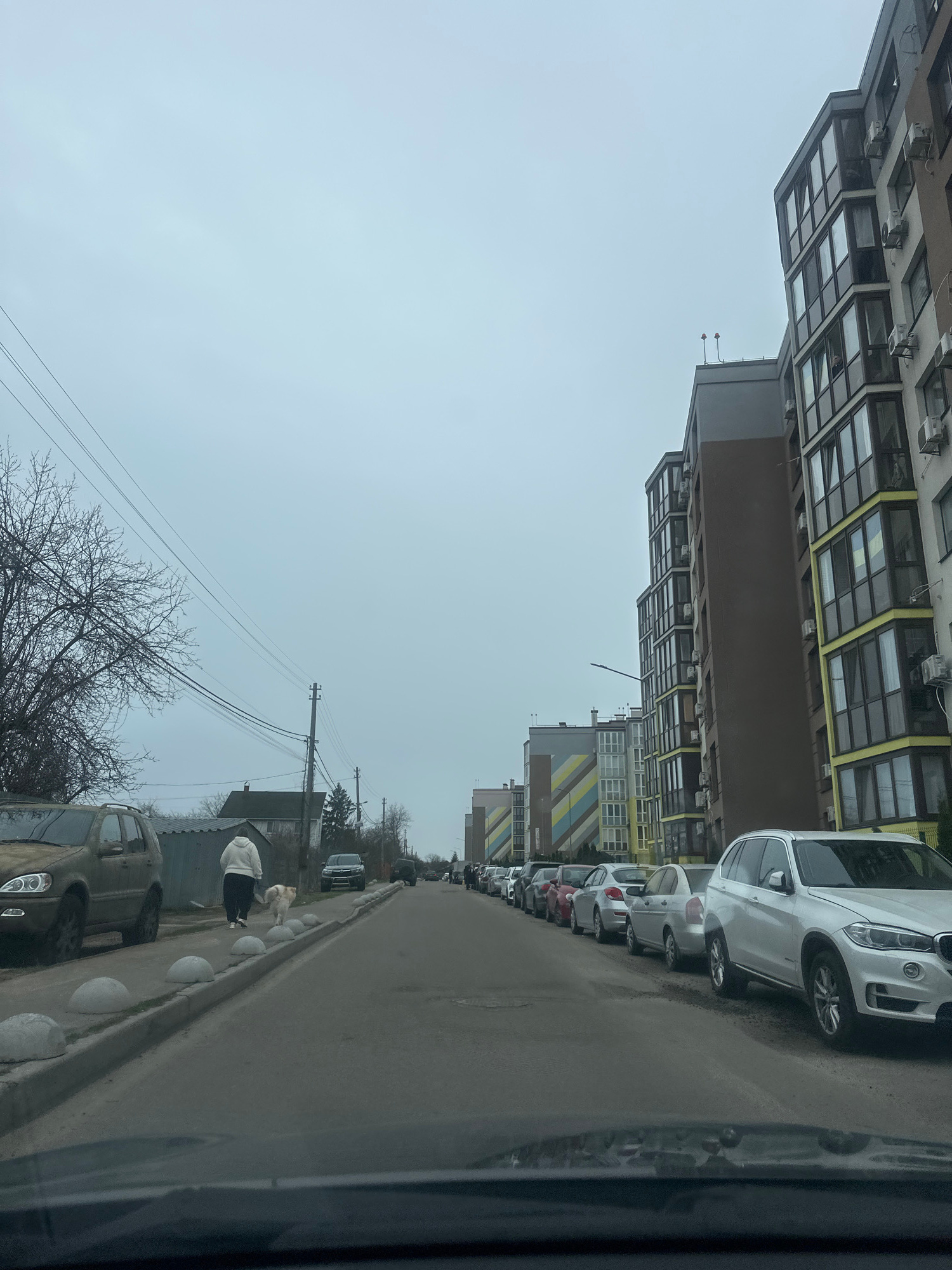 The image shows a street scene in Kyiv, Ukraine on an overcast day. A tall apartment building with a grid of windows and yellow accents stands on the left. A line of parked cars, mostly white, stretch…read more