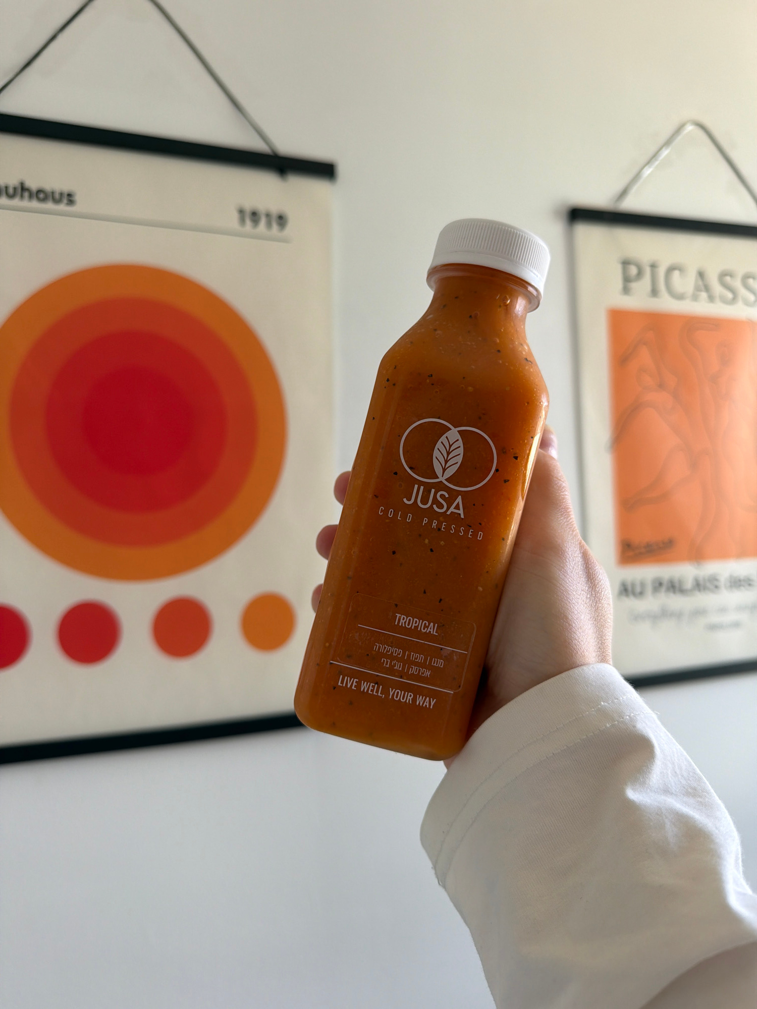 A person's hand in a white sleeve is holding a bottle of "JUSA COLD PRESSED" "TROPICAL" juice. The background contains two posters on a white wall. The first poster reads "PICASS" and "AU PALAIS des."…read more
