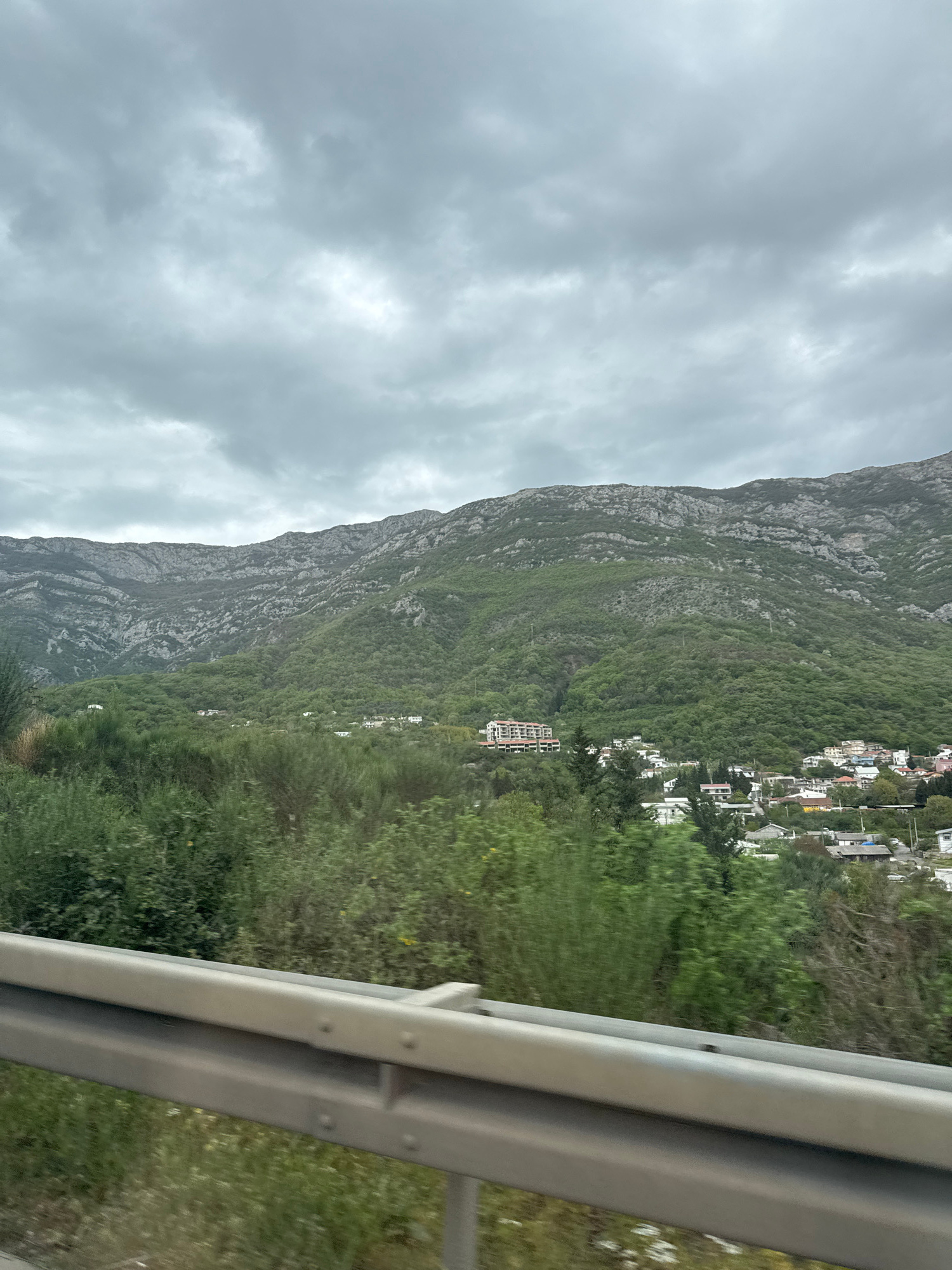 The image shows a mountain landscape near Sutomore, Montenegro, viewed from behind a metal guardrail. A rocky mountain slopes downward, covered with green vegetation. Scattered white buildings are vis…read more