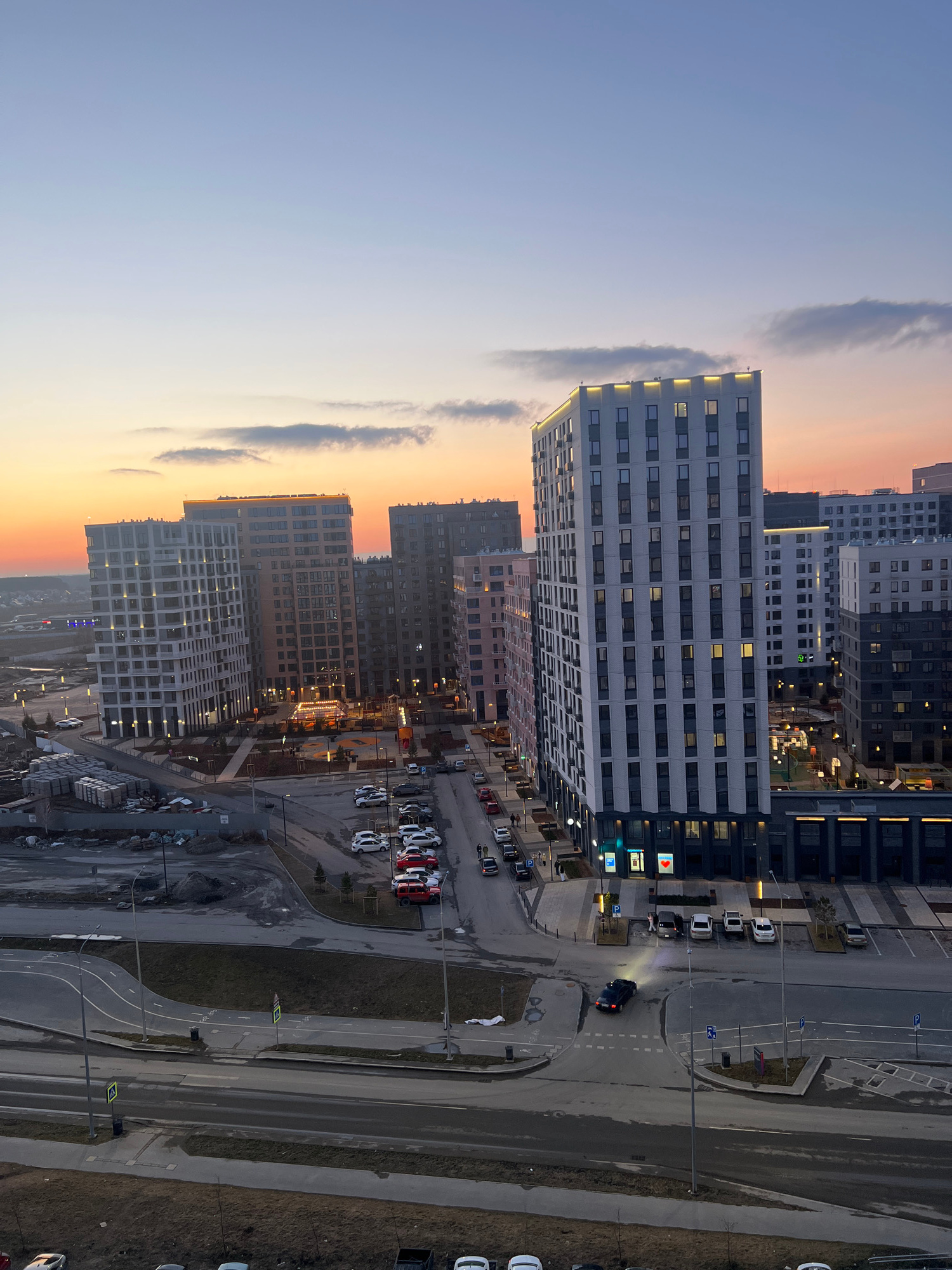 The image shows a cityscape at dusk in Tyumen, Russia. The sky transitions from blue to orange near the horizon, with some cloud cover. The scene depicts a cluster of modern high-rise residential buil…read more