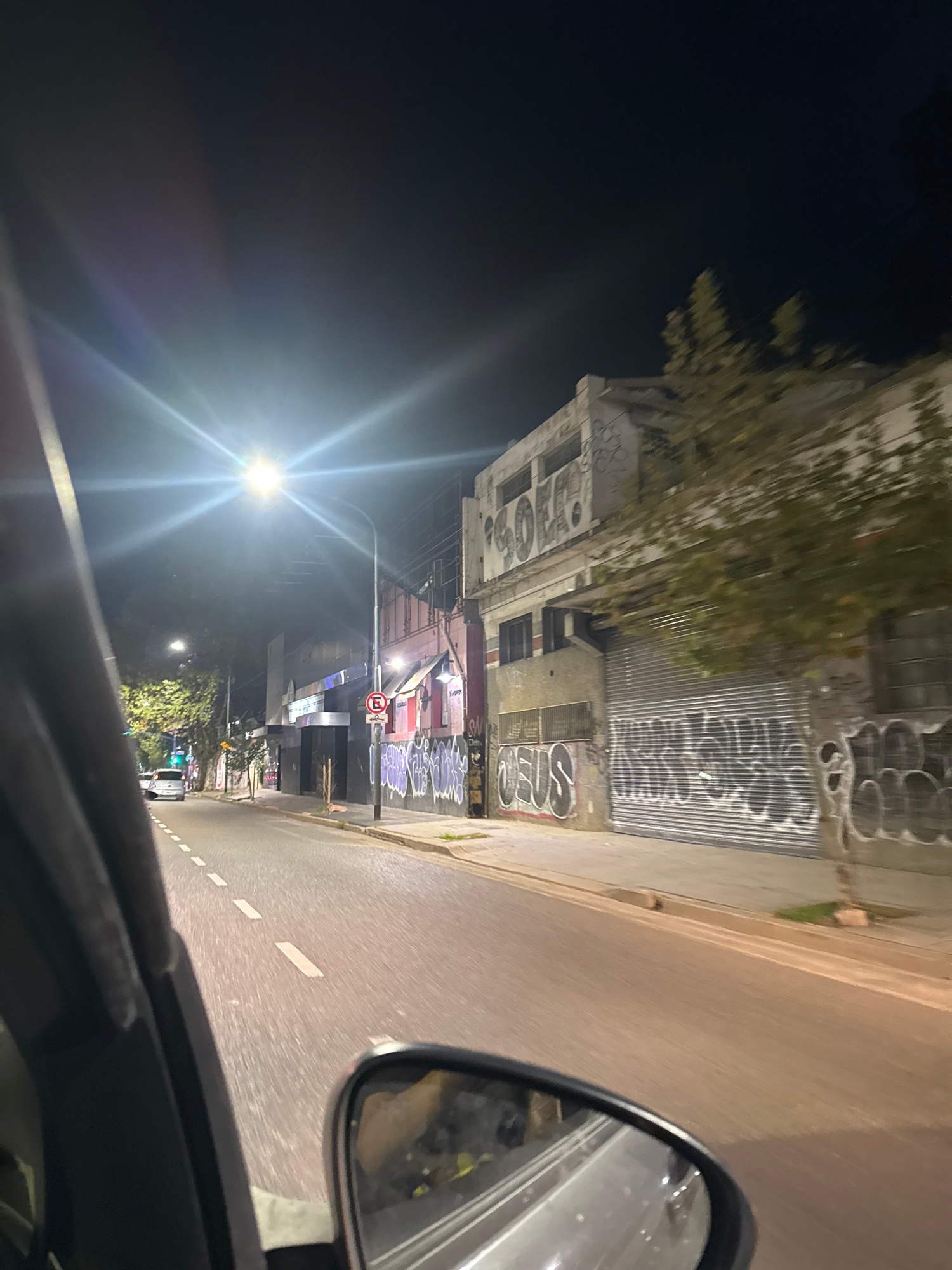The image shows a nighttime street scene in Buenos Aires, Argentina, taken from the perspective of someone inside a car. The car is moving along a relatively empty street. Buildings line the left side…read more