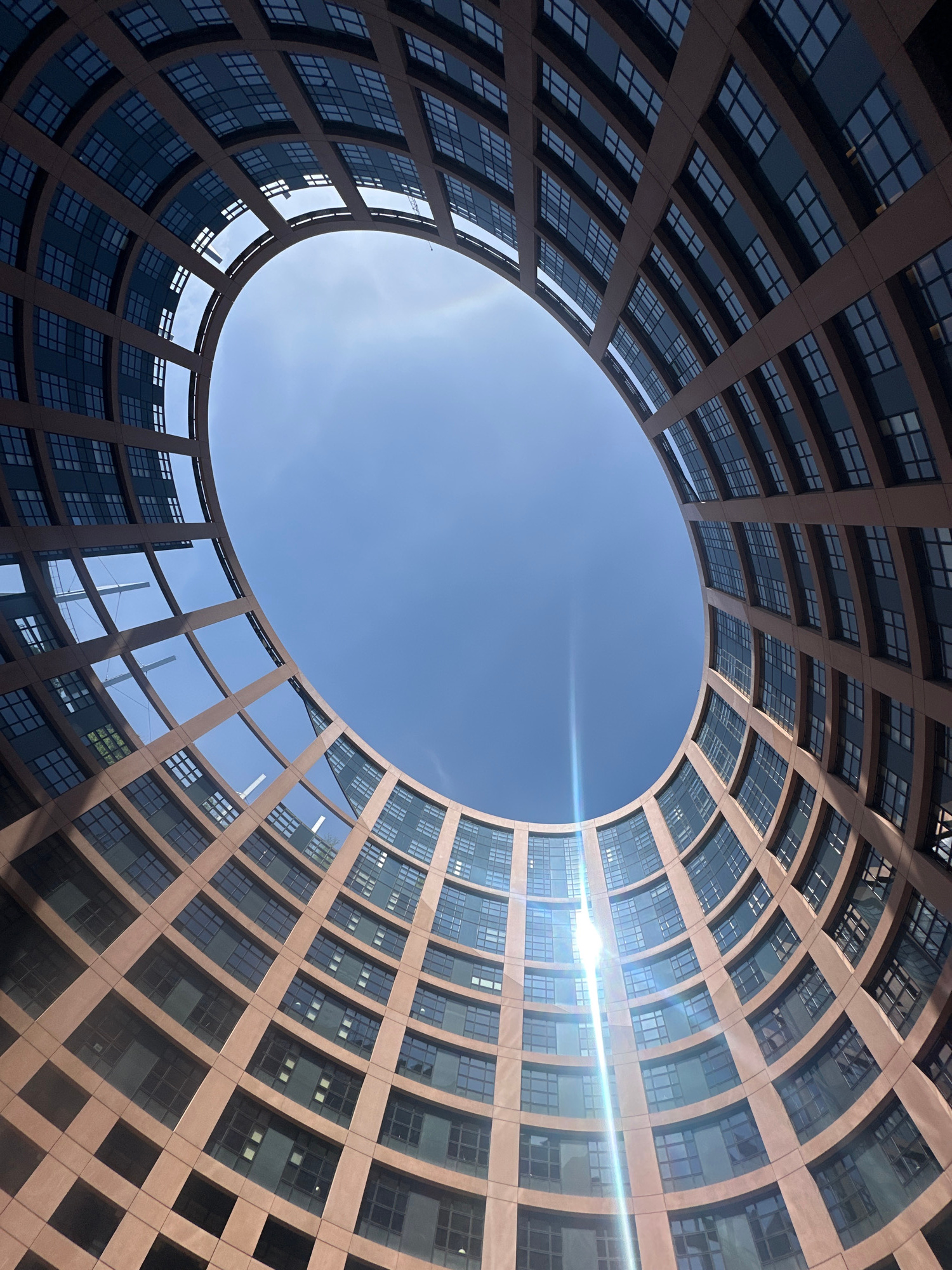 The image presents a striking worm's-eye view, looking directly upwards from within the central courtyard of a distinctive circular or oval-shaped building in Strasbourg, France. The architecture crea…read more