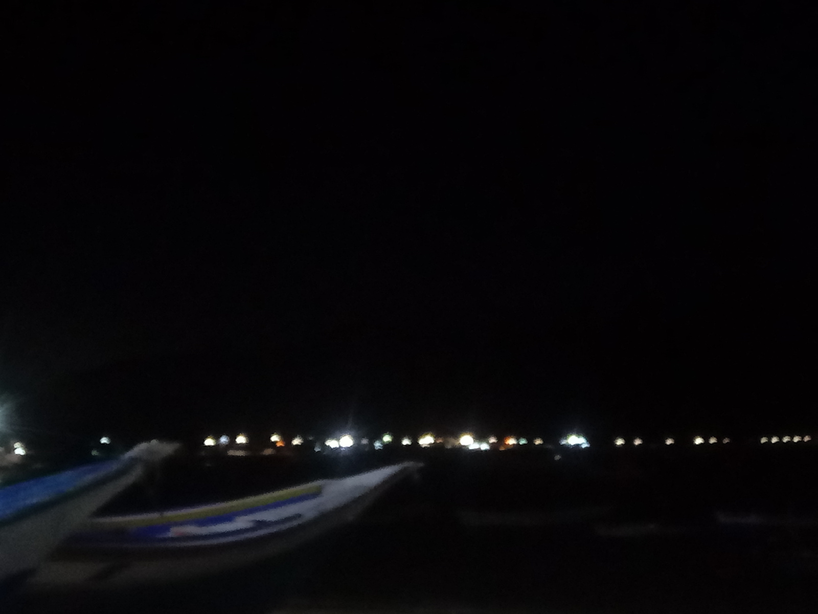 At night in Juan Griego, Venezuela, two boats sit close to the water. The horizon shows a series of lights, likely from buildings or streetlights in the distance. The sky above is dark.