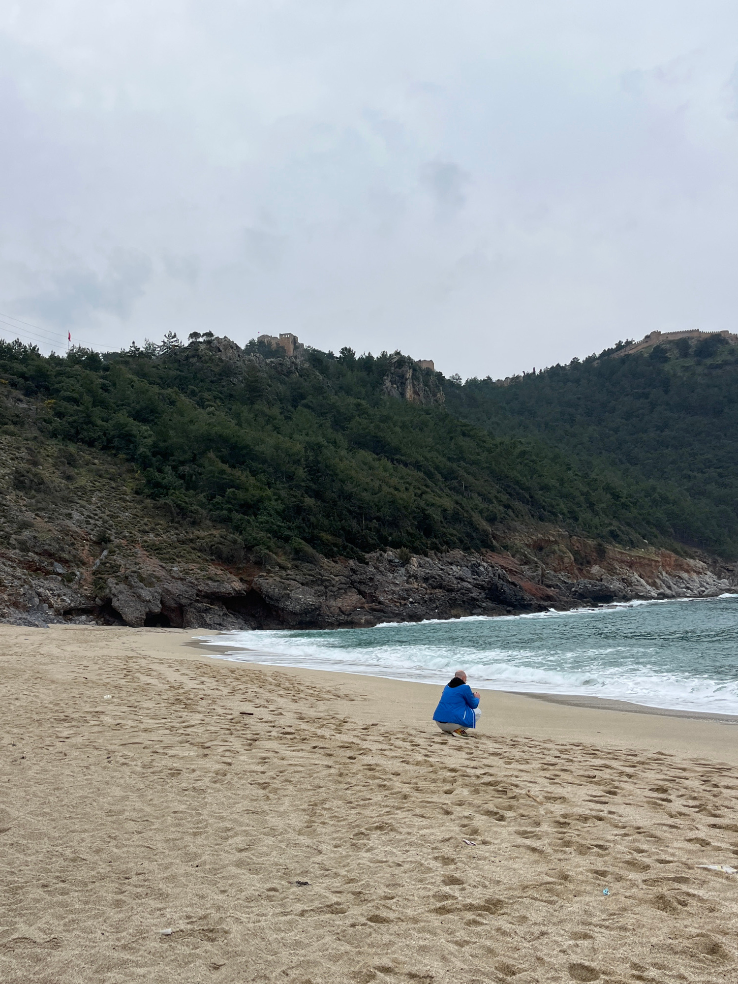 The image depicts a coastal scene in Alanya, Turkey, specifically a sandy beach situated along the base of the Alanya Peninsula, facing the Mediterranean Sea. The sky is overcast and grey. In the for…read more