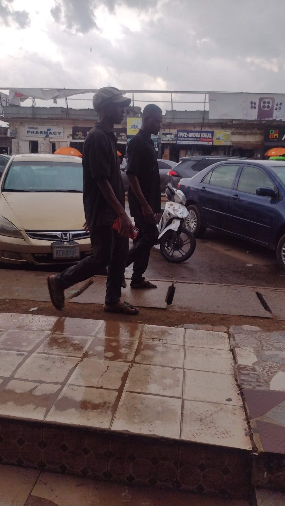 The scene depicts a street in Jos, Nigeria, with two men walking on a tiled sidewalk. The men are dressed in dark clothing. One man is holding a red phone. Parked cars line the street including a blue…read more