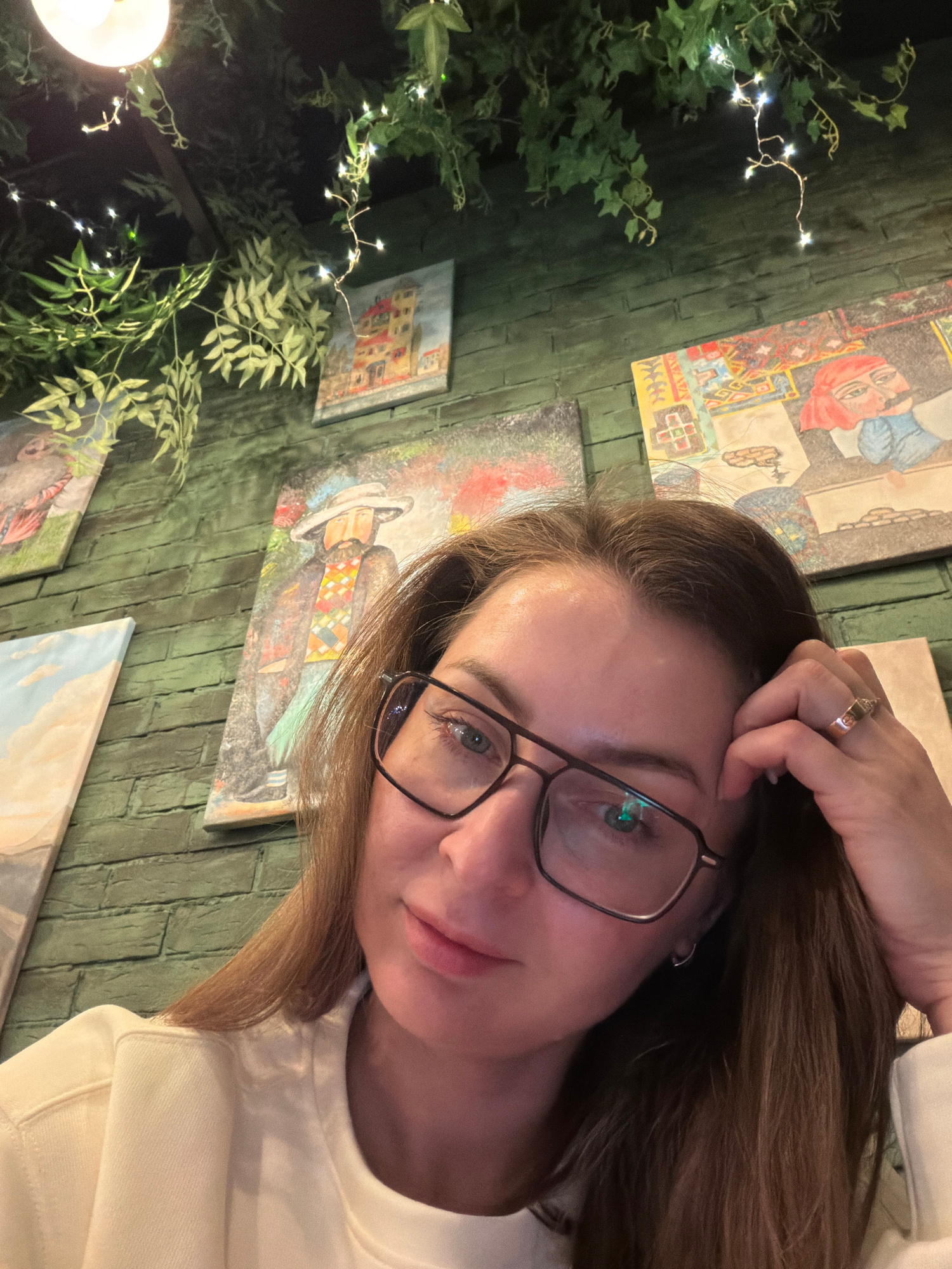 A woman with light brown hair and wearing glasses poses for a selfie. Her right hand is touching her forehead, and she is wearing a ring on her right ring finger. She is wearing a light-colored sweate…read more