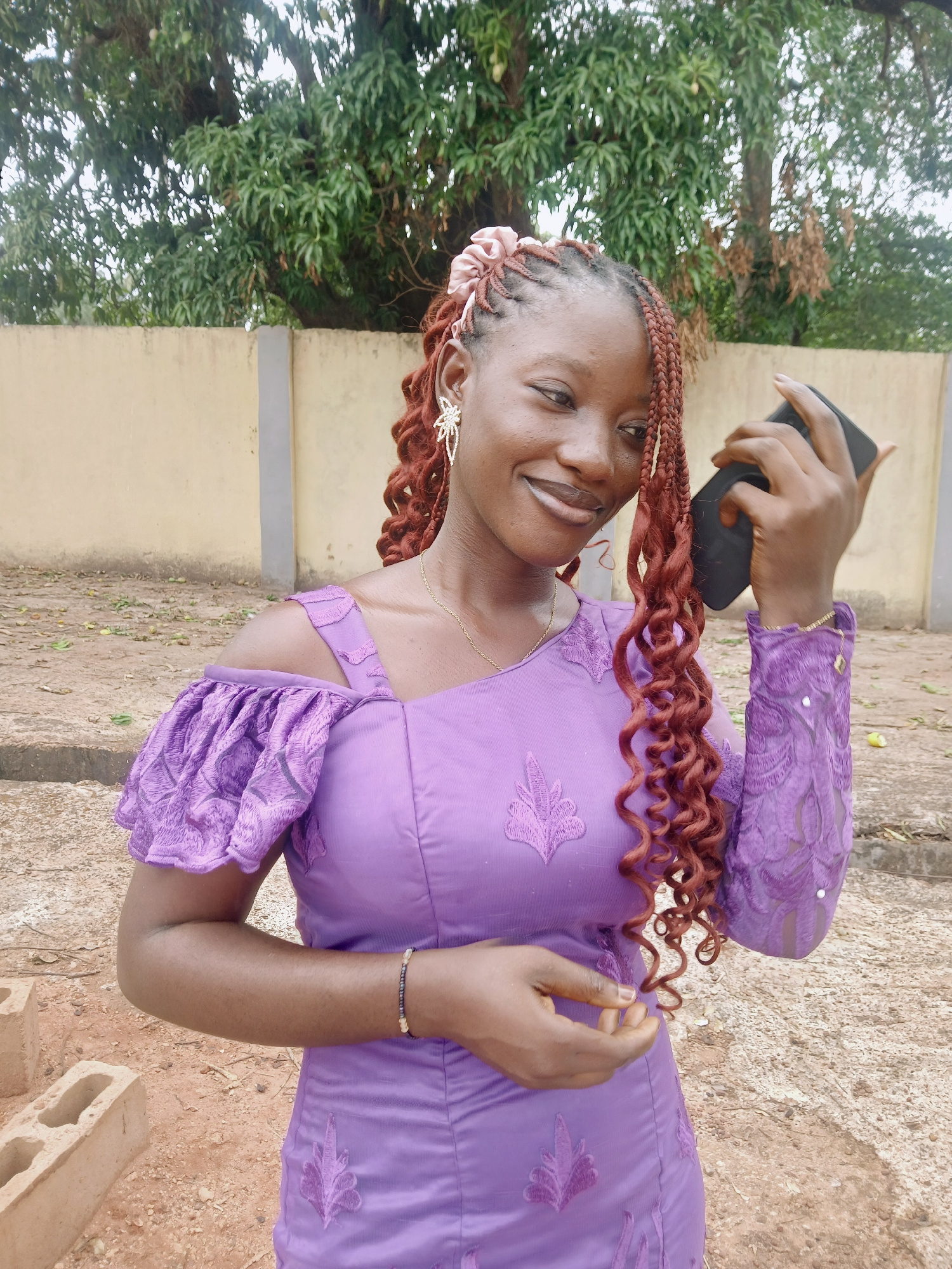 A woman stands outdoors in Kitwe, Zambia, holding a smartphone, possibly taking a selfie. She is wearing a purple dress with lace accents and has long red braids. She appears to be smiling. The backgr…read more
