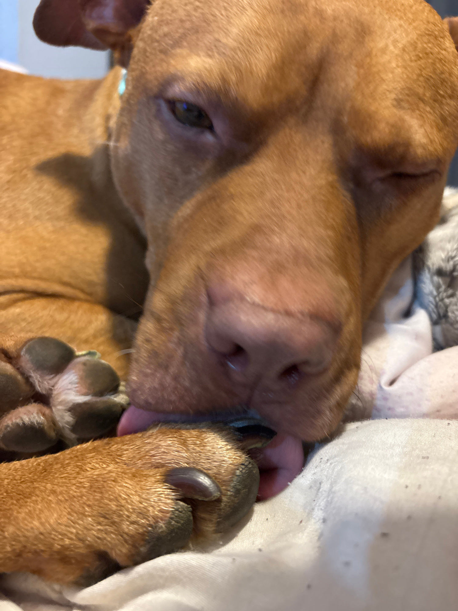 A tan-colored dog is close up, licking its own paw, which is resting on a white and grey patterned soft surface. The dog has brown eyes and a small collar. The dog's paw has black pads and long, dark…read more
