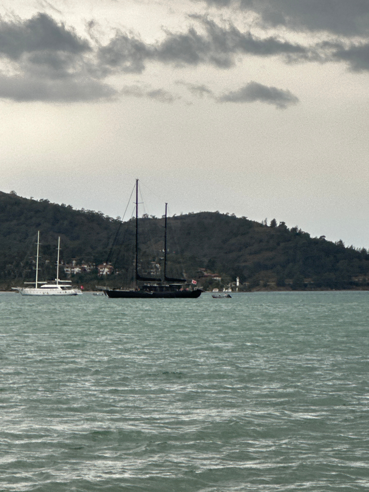 The image depicts a view of Fethiye, Turkey, featuring the sea, a hillside, and the sky. Two sailboats are visible in the water, one with dark-colored masts and hull, and another with white masts and…read more