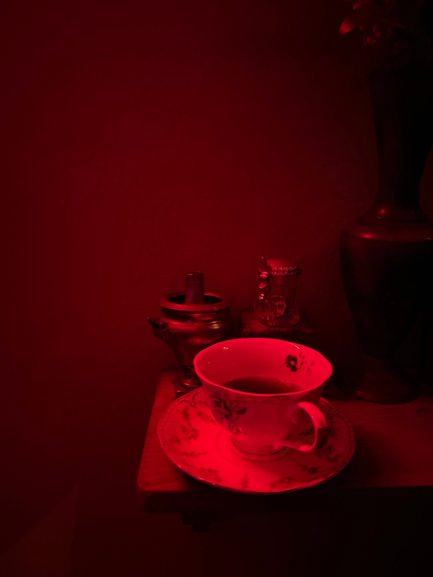 The image, bathed in a red light, presents a still life scene. A patterned teacup sits on a matching saucer, next to a glass. Below them is an ornate metal teapot or beverage dispenser. Above these it…read more