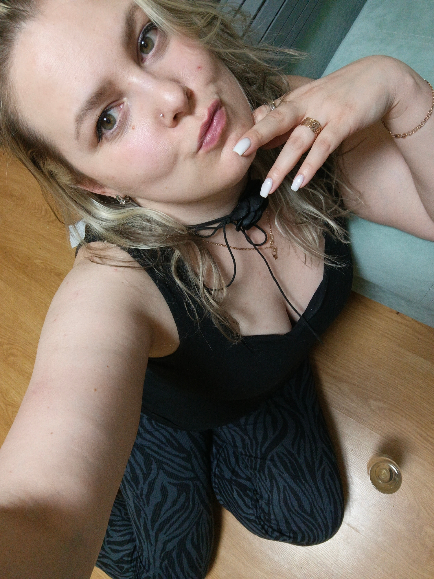 A woman is posing for a selfie. She has blonde hair and is wearing a black tank top and patterned leggings. She is kneeling on a wooden floor. Her hand is raised to her face, showcasing a ring and bra…read more