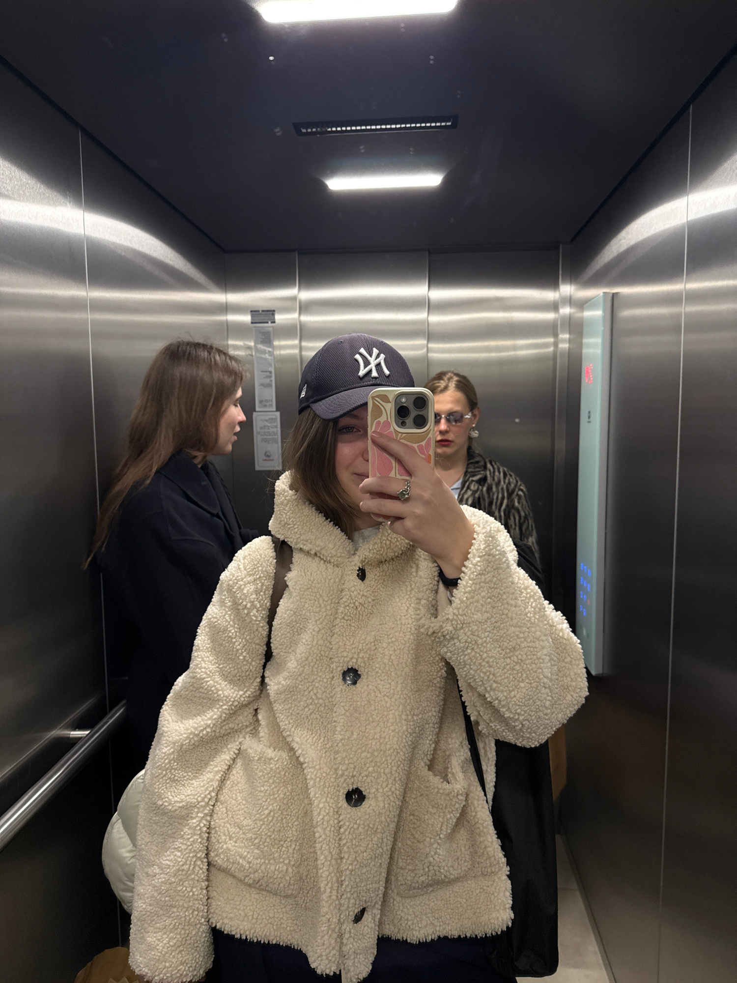 The image captures three individuals reflected in a mirror selfie taken inside a modern elevator. The primary subject, a female centered in the foreground, wears a dark blue New York Yankees baseball…read more
