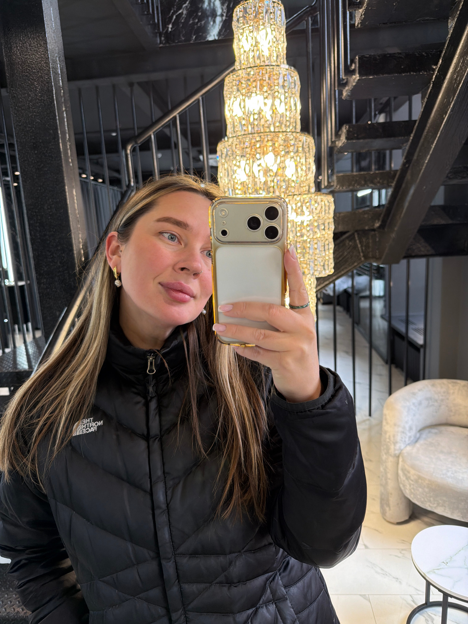 A woman is taking a selfie in a building. The location is Moscow, Russia. The woman is holding an iPhone in her right hand. She is wearing a black puffer jacket and a ring on her finger. She has long,…read more