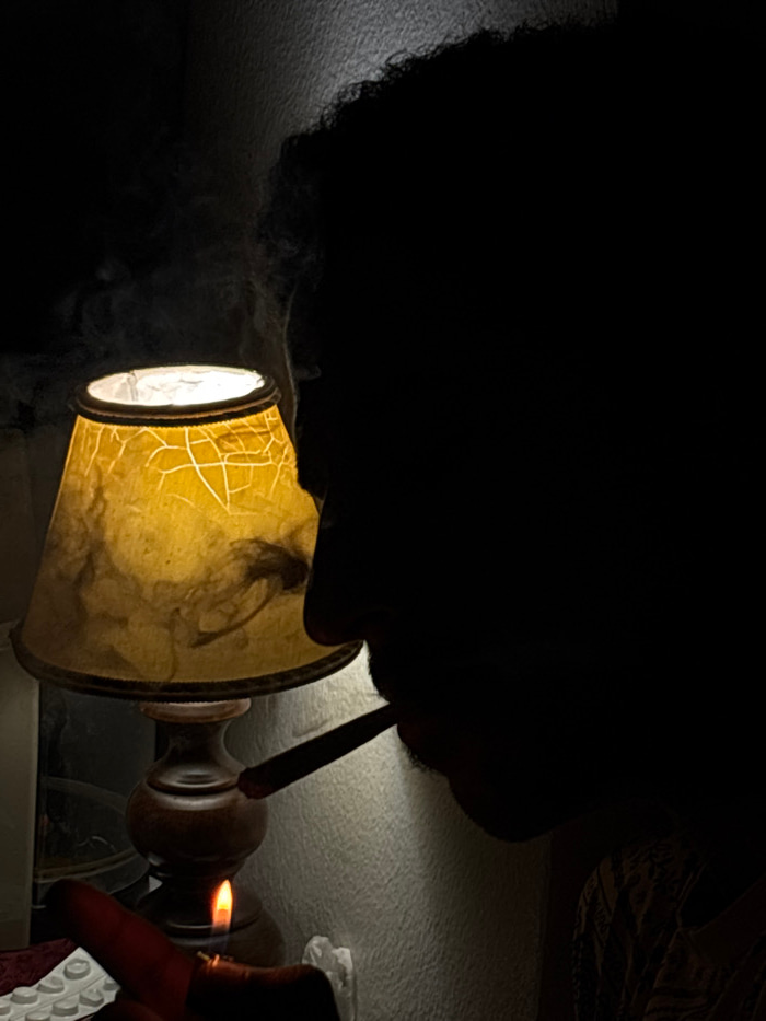 A dimly lit scene shows a person's hand holding a lit object near a bedside lamp. Smoke drifts toward the cracked lampshade, partially obscuring the light. The person's face is obscured in shadow. The…read more