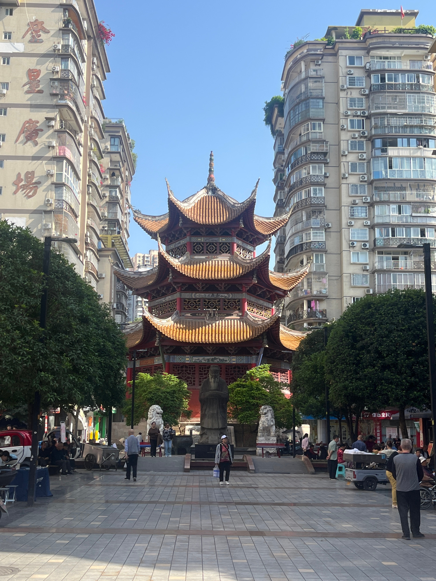 This image captures a vibrant urban scene in Jiangjin, China, on a bright, sunny day. The central focus is a magnificent, multi-tiered traditional Chinese pagoda-style building, characterized by its o…read more