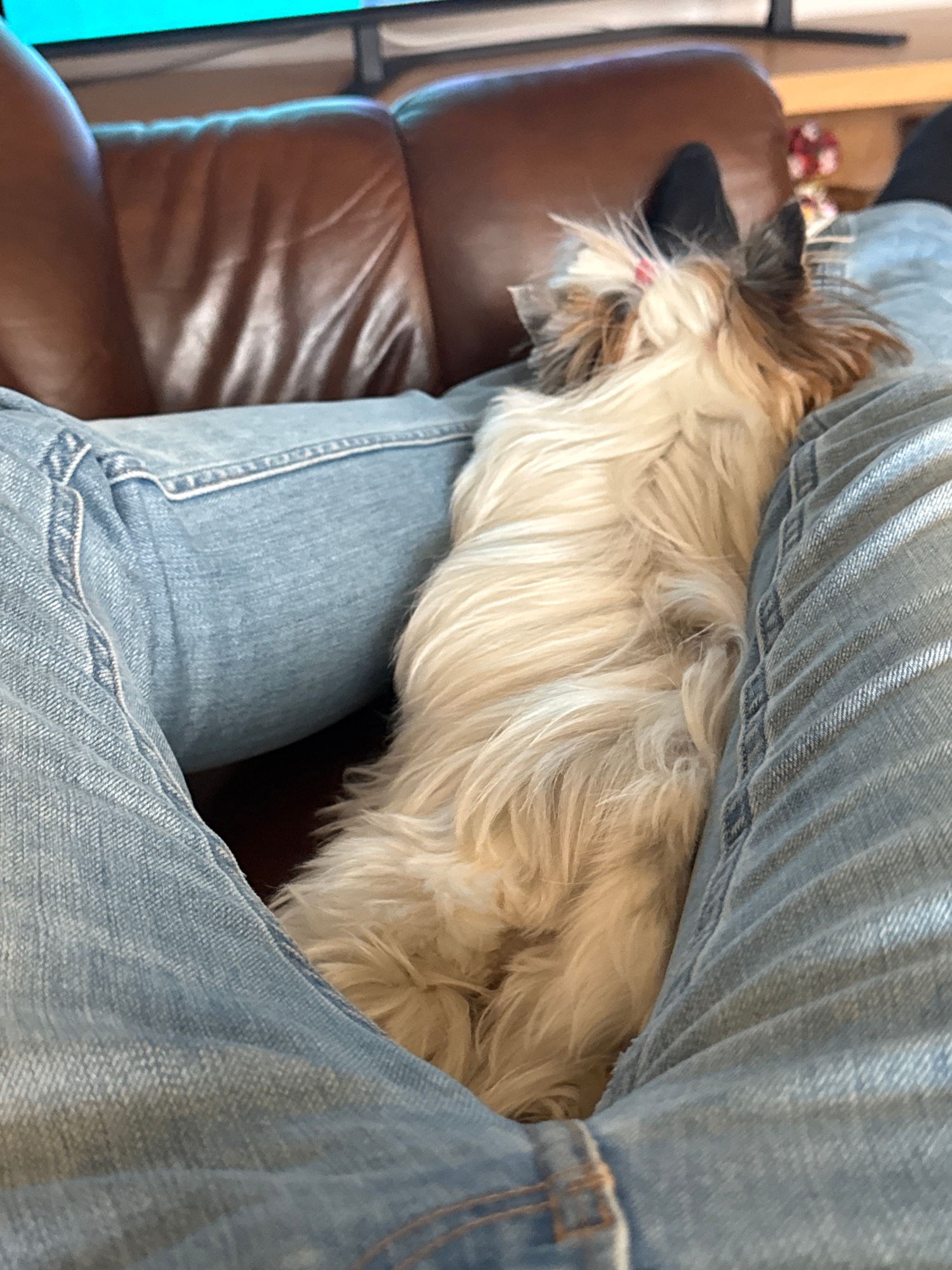 The image shows a person wearing light blue jeans sitting on a brown leather couch. A small, long-haired dog with white and tan fur is nestled between the person's legs. The dog's head is resting on t…read more
