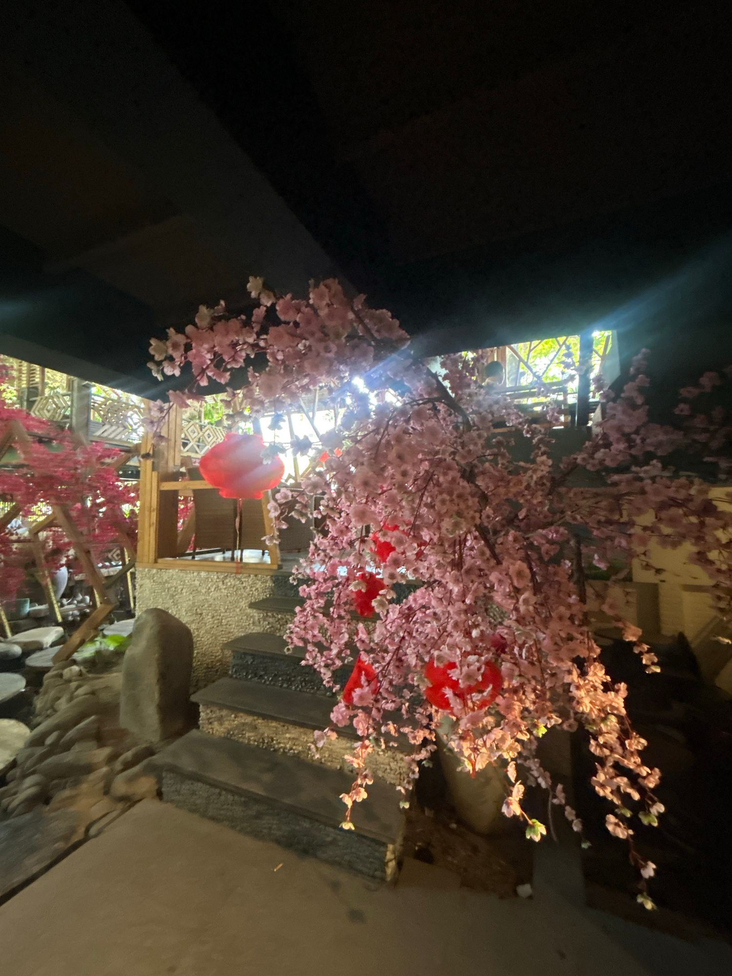This image captures a vibrant and heavily decorated indoor or semi-enclosed space, looking upwards at an ornate ceiling and upper areas. The scene is dominated by numerous artificial pink cherry bloss…read more