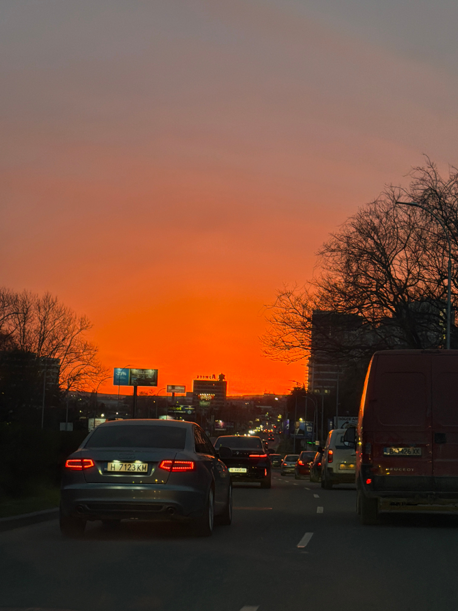 The image shows a street in Varna, Bulgaria at dusk. An Audi car with the license plate H 7123 KM is prominently featured, positioned on the right side of the road. A line of traffic extends ahead, in…read more