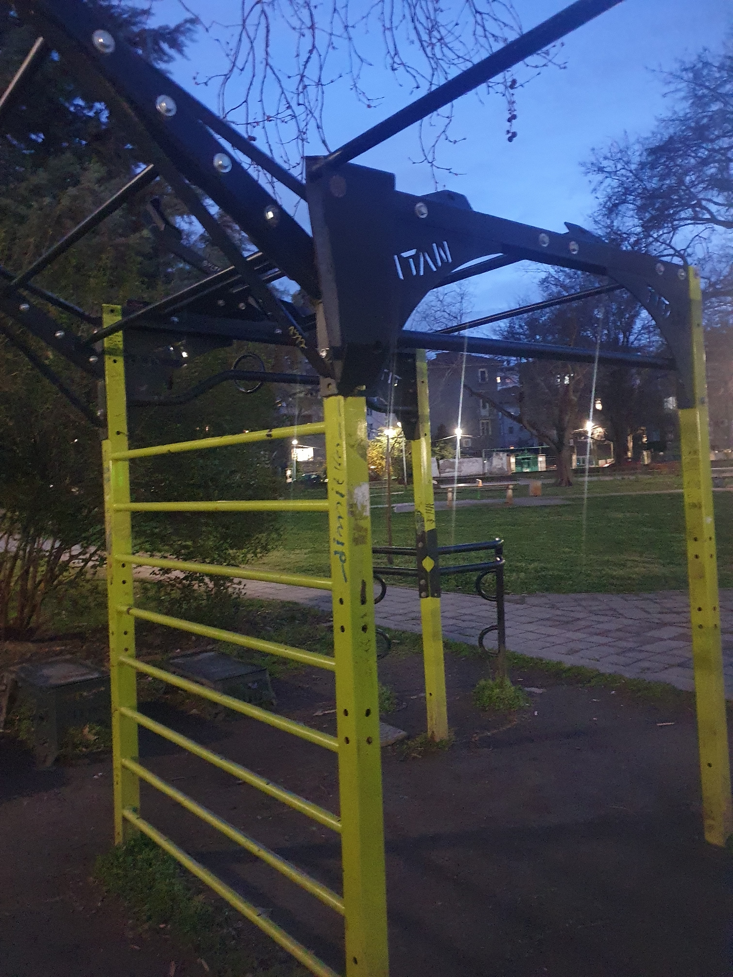 The image depicts outdoor fitness equipment in Plovdiv, Bulgaria, likely in a park or public space. The equipment features a black metal climbing structure and a yellow metal ladder with rungs. The gr…read more