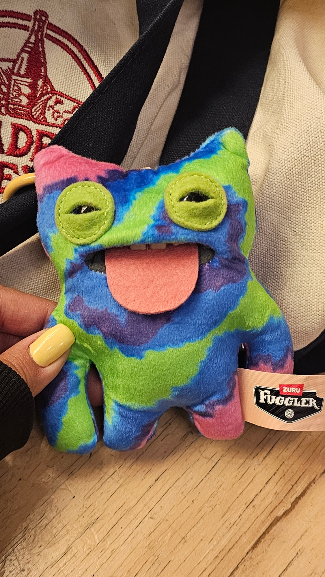 A close-up shot shows a colorful, plush toy, possibly a "Fuggler" brand toy, resting on what appears to be a wooden surface. The toy is a mix of green, blue, purple, and pink hues, featuring large, roβ¦read more