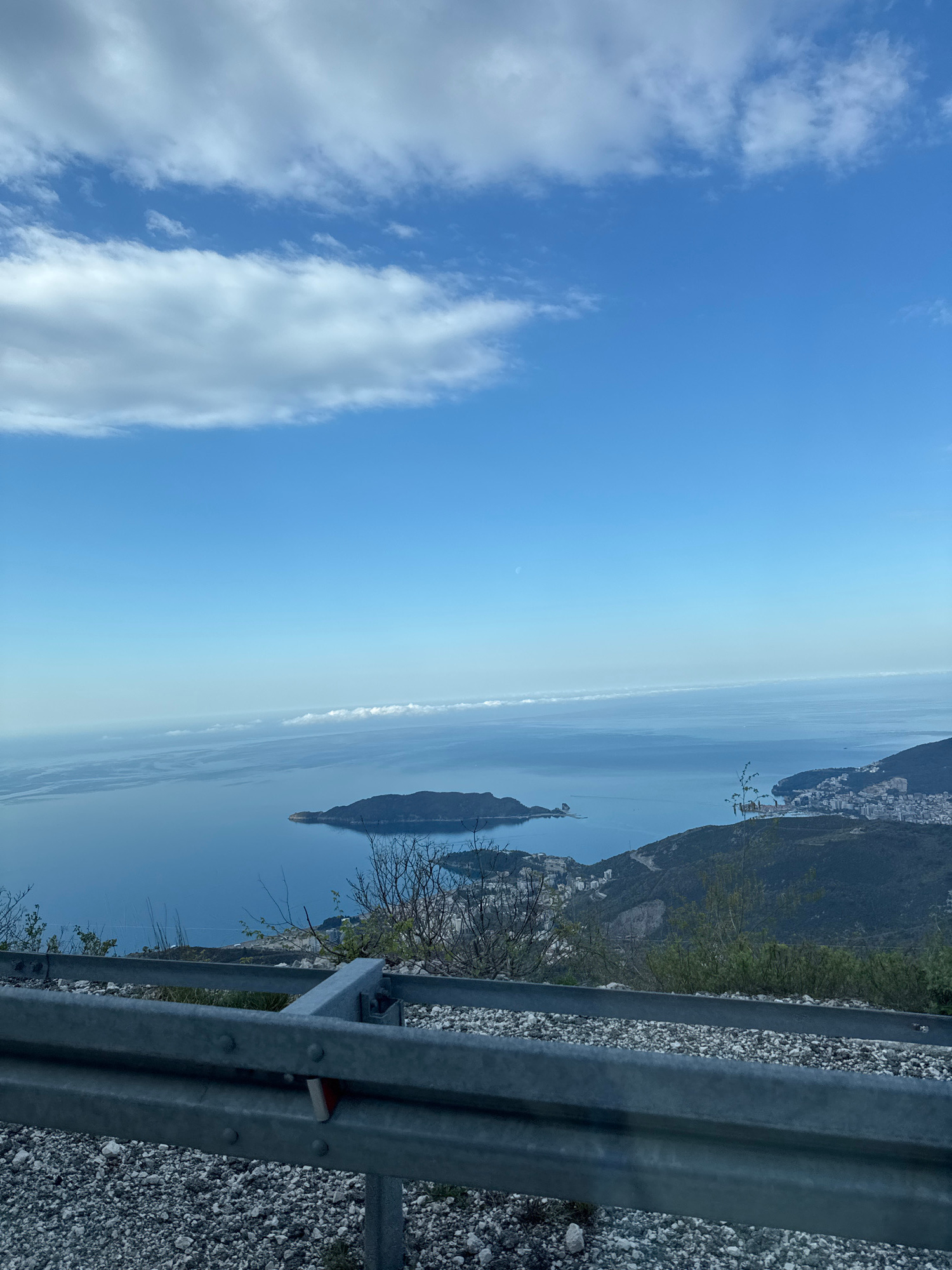 A landscape view from a high vantage point, likely near the city of Brajici, Montenegro, captures the Adriatic Sea under a bright blue sky with scattered white clouds. The body of water stretches towa…read more