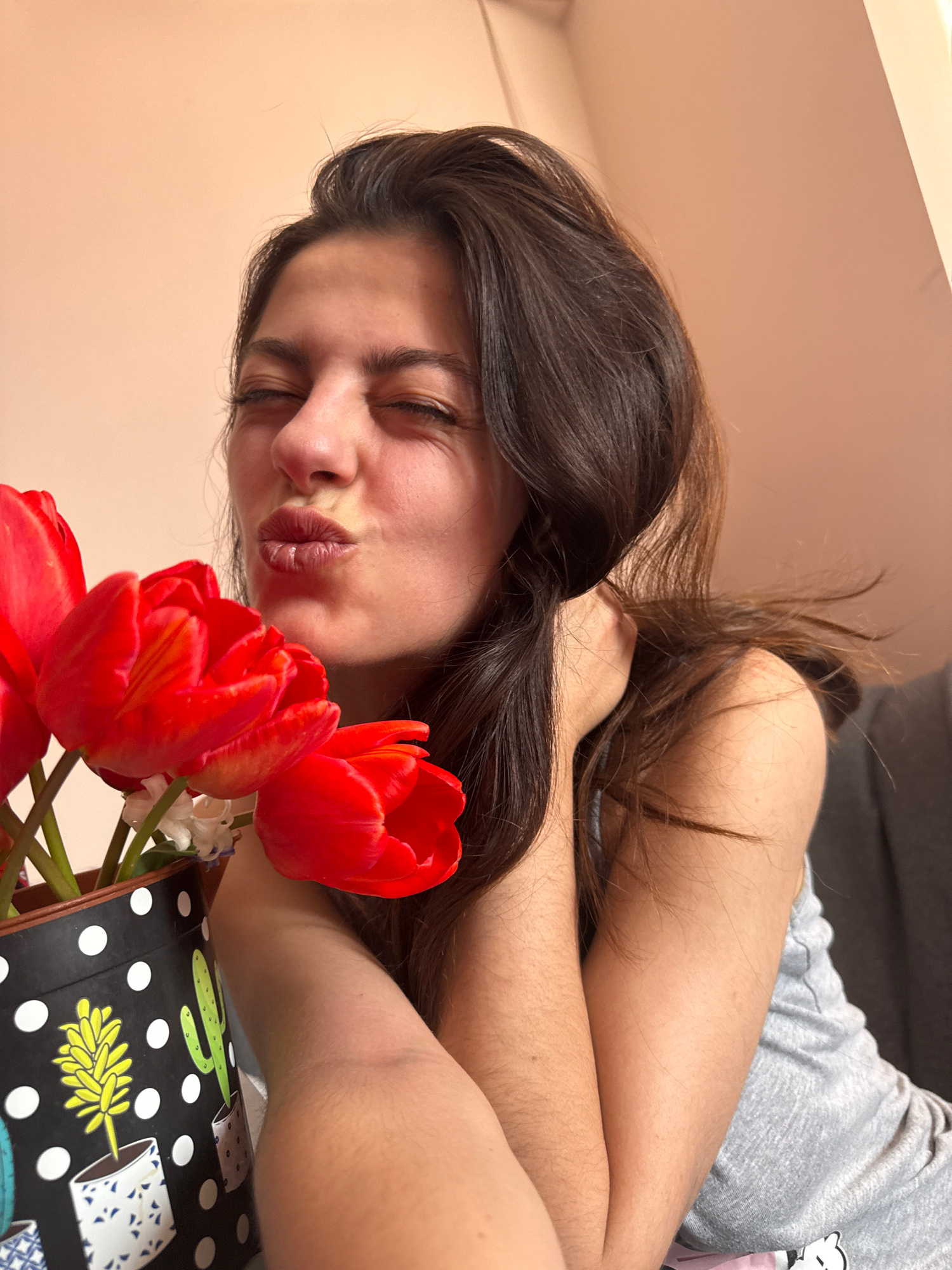 A young woman is lying down with a bouquet of red tulips. She is wearing a gray shirt and has brown hair. The bouquet of flowers is in a black box with a cactus and plant pot design. The environment i…read more