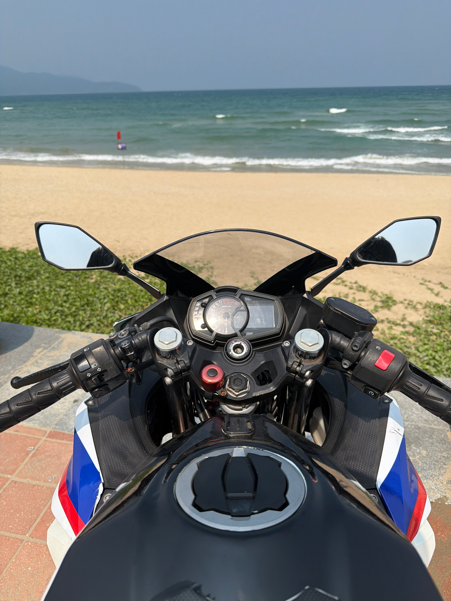 From an elevated point of view, the image captures the dashboard and handlebars of a motorcycle. The motorcycle is parked on a brick-paved surface, next to a patch of green foliage. In the background,…read more