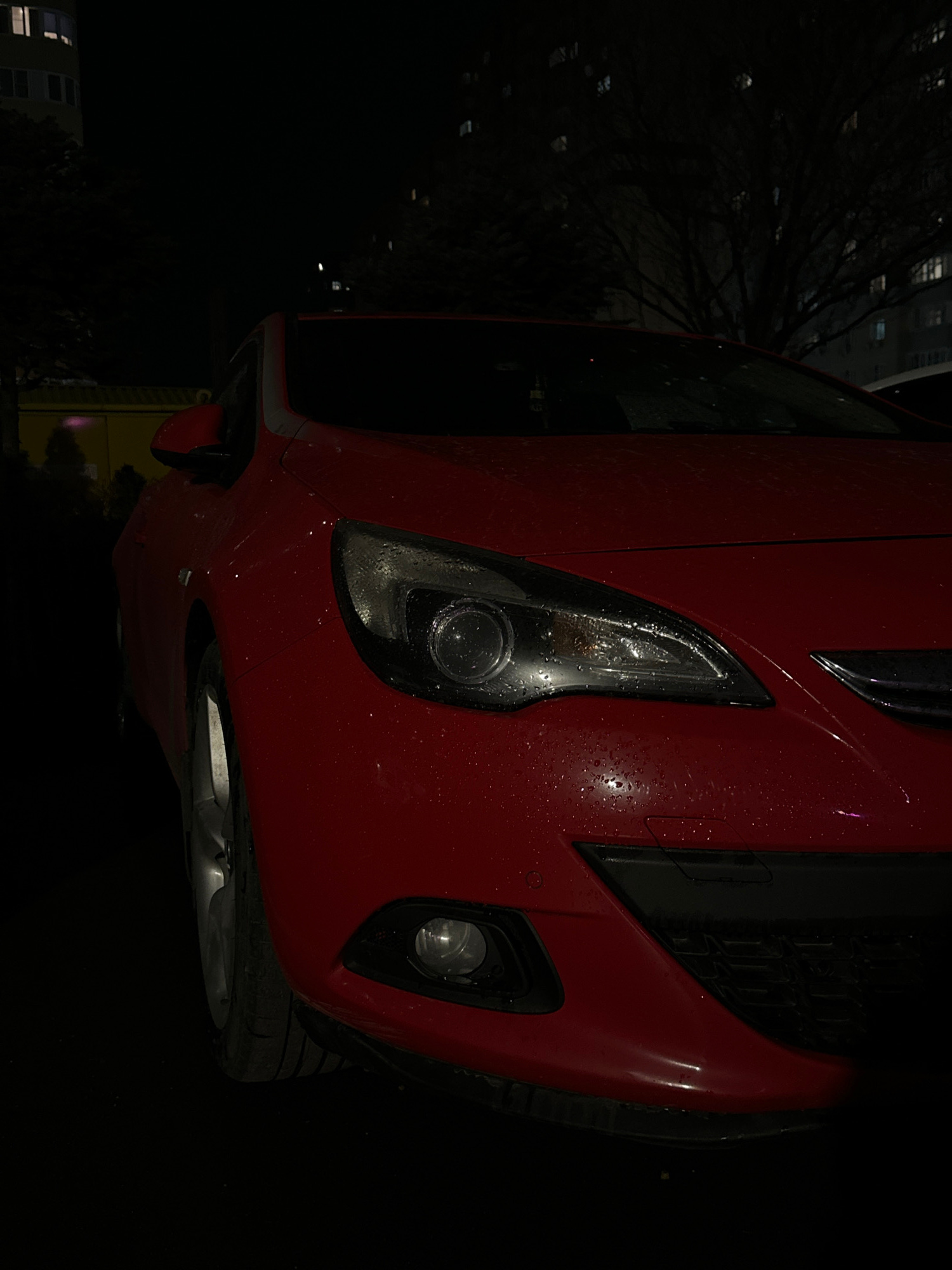 A close-up, low-angle shot depicts the front of a red car, possibly a hatchback, parked on a dark street. The vehicle is wet, with visible water droplets on the headlight and body. The headlight is on…read more